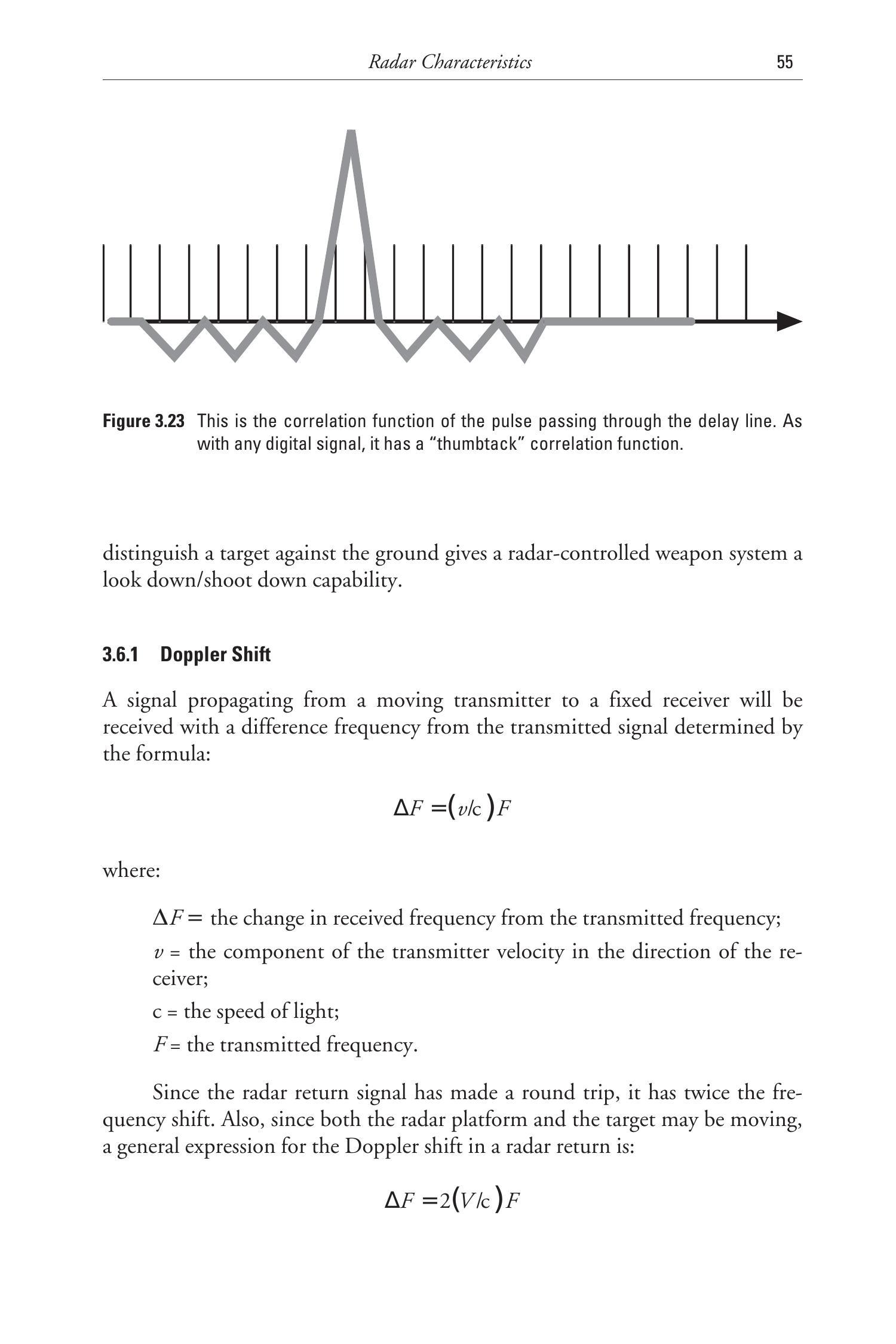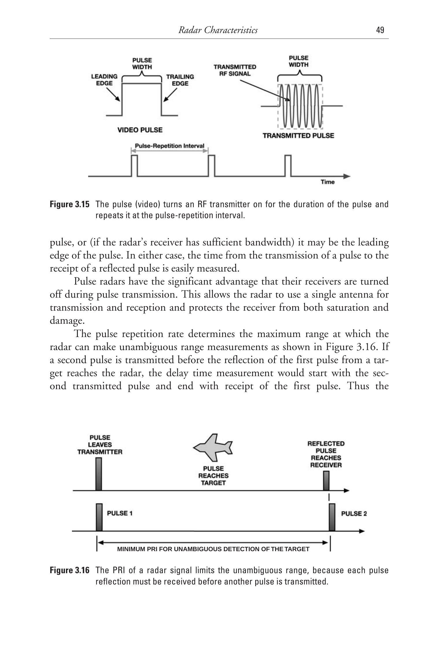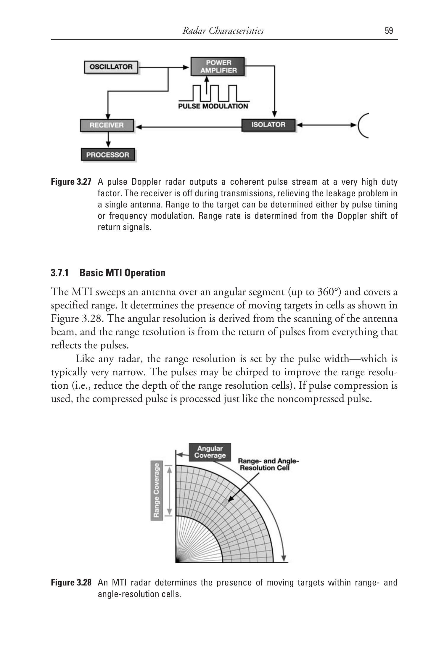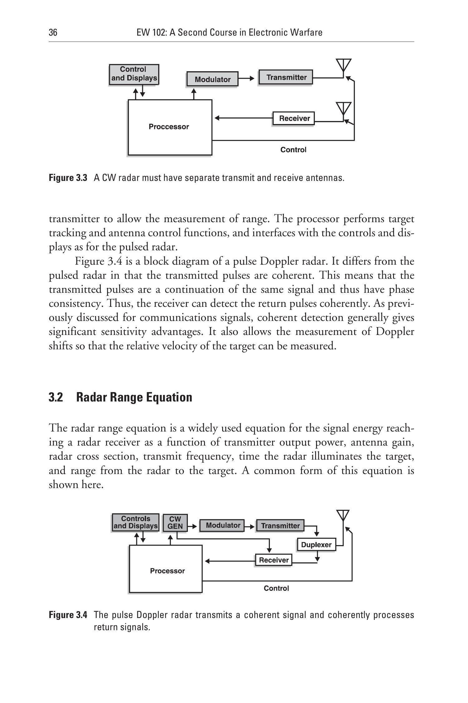 图3.4是脉冲多普勒雷达的框图。它与脉冲雷达的不同在于发射的脉冲是相干的。这意味着发射脉冲是同一信号的延续,因此具有相位一致性。因此,接收机能够相干地检测回波脉冲。正如在通信信号中讨论过的,相干检测通常具有显著的灵敏度优势。它还允许测量多普勒频移,从而测定目标的相对速度。