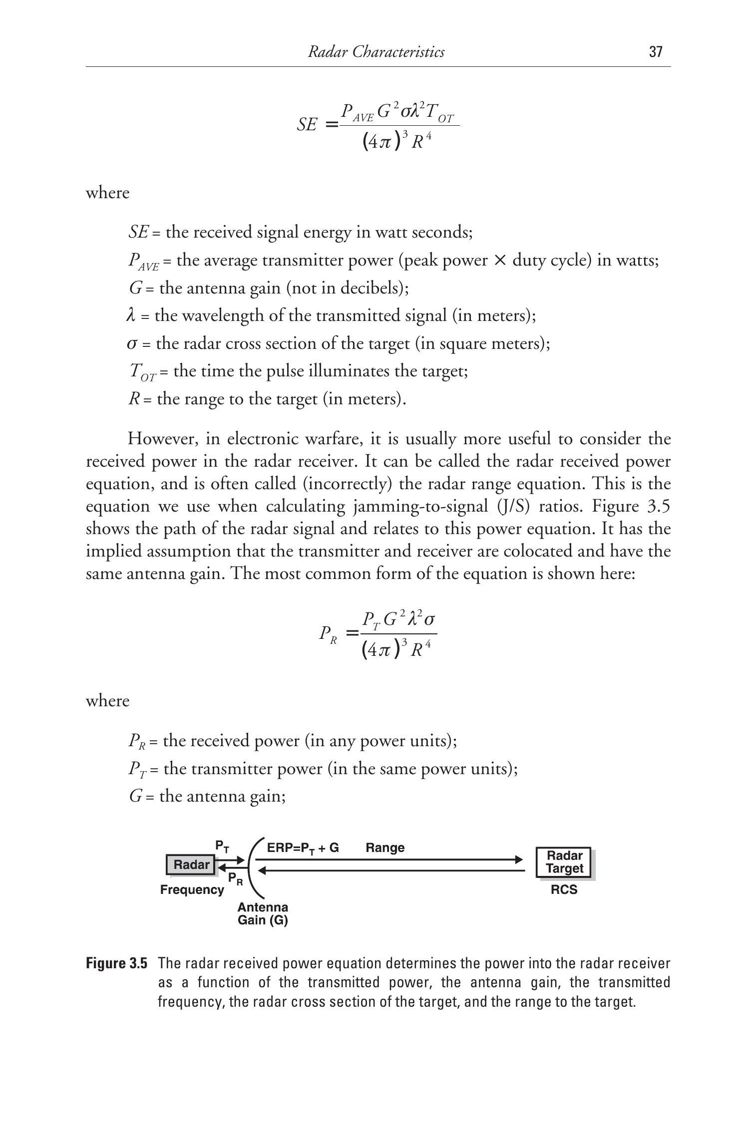 然而,在电子战中,更常用的是考虑雷达接收机中的接收功率。它可以称为雷达接收功率方程,但通常(错误地)被称为雷达距离方程。这是我们在计算干扰/信号比(J/S)时使用的方程。图3.5展示了雷达信号的传输路径,并与该功率方程相关。它隐含假设发射机和接收机共址并具有相同的天线增益。该方程的最常见形式如下: