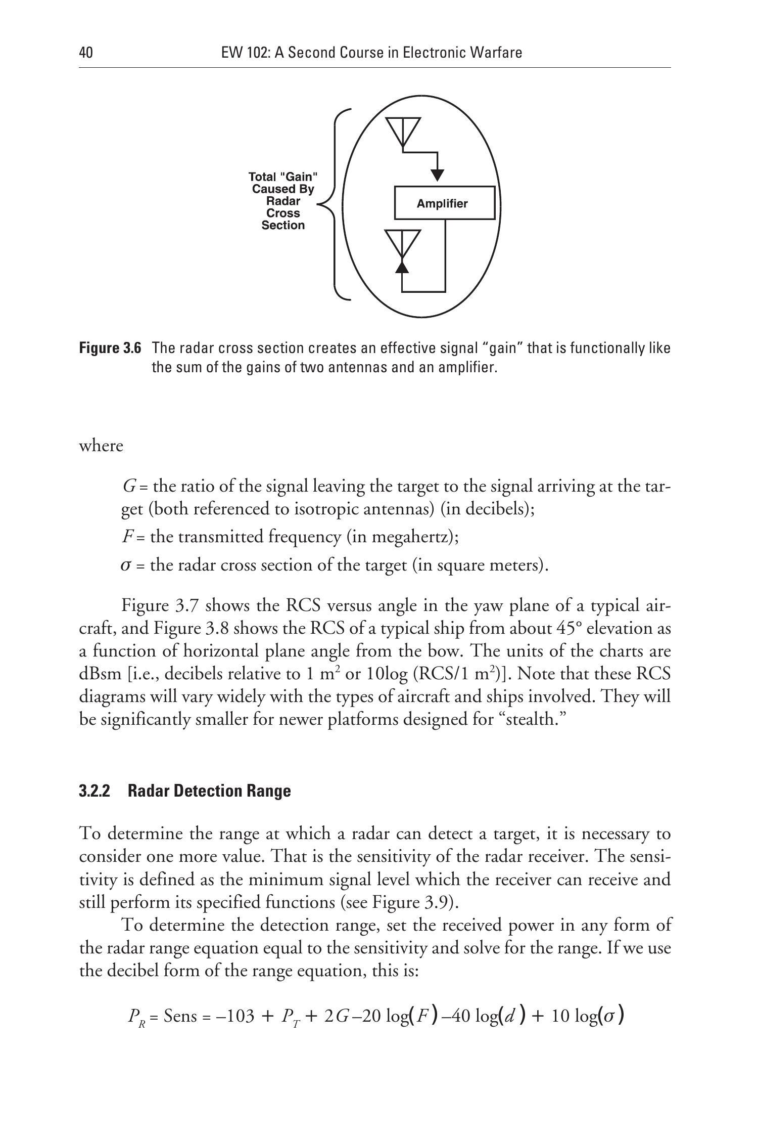 图3.6 雷达截面积产生一种等效信号“增益”,其作用类似于两副天线和一个放大器的增益之和。