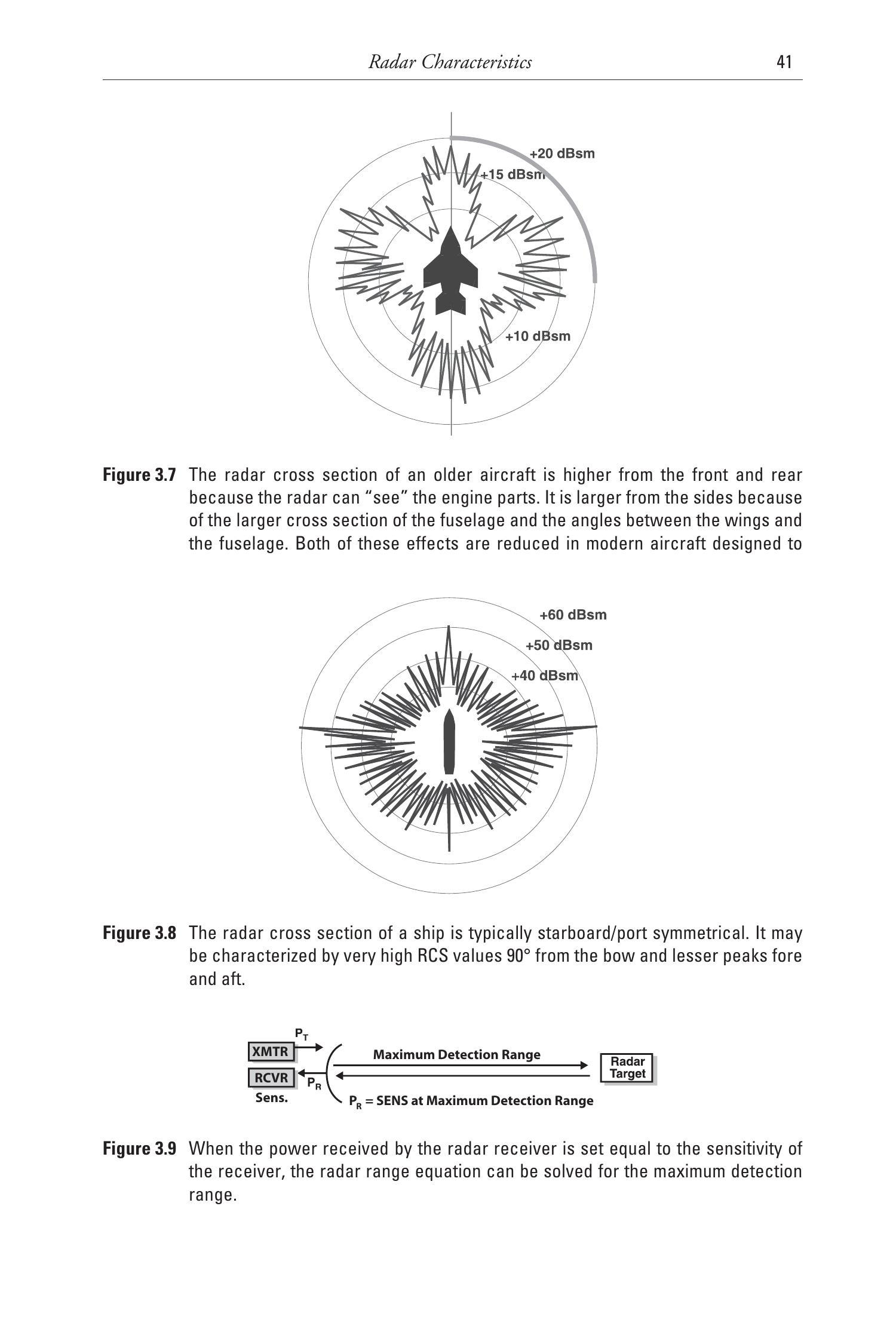 图3.7展示了一架典型飞机在偏航平面上的RCS随角度的变化,图3.8展示了一艘典型舰船在约 \(45^{\circ}\) 俯仰角下,随艏向水平角度变化的RCS。图表单位为dBsm(即相对于 \(1 \mathrm{~m}^{2}\) 的分贝值,\(10 \log (\mathrm{RCS}/1 \mathrm{~m}^{2})\))。需要注意,这些RCS图会随飞机和舰船类型的不同而变化。对于为“隐身”设计的新型平台,它们的RCS将显著减小。