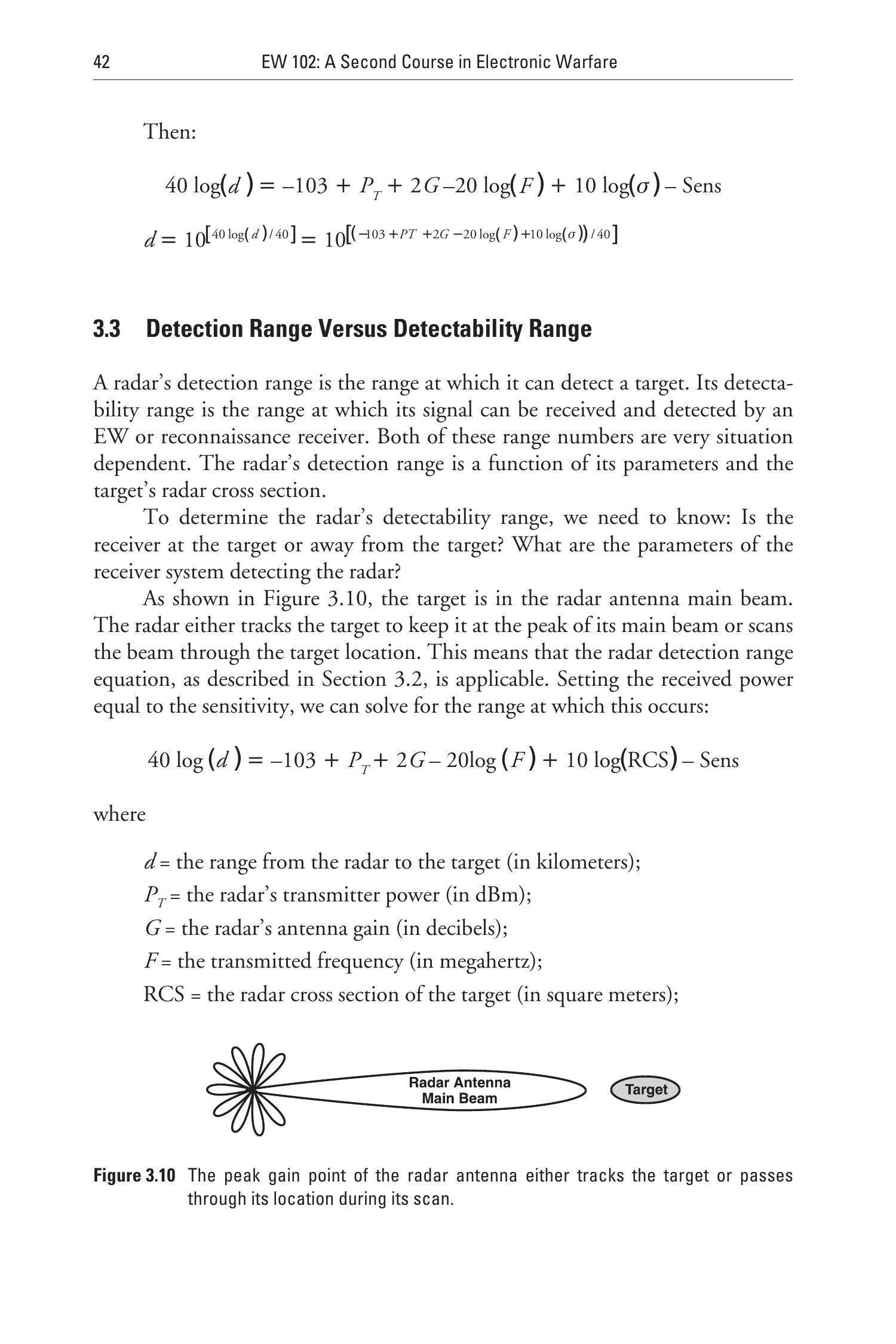 如图3.10所示,目标处于雷达天线主瓣内。雷达要么跟踪目标以保持其位于主瓣峰值位置,要么在扫描过程中让波束扫过目标位置。这意味着第3.2节中描述的雷达探测距离方程是适用的。将接收功率设为等于接收机灵敏度,我们可以解出对应的探测距离: