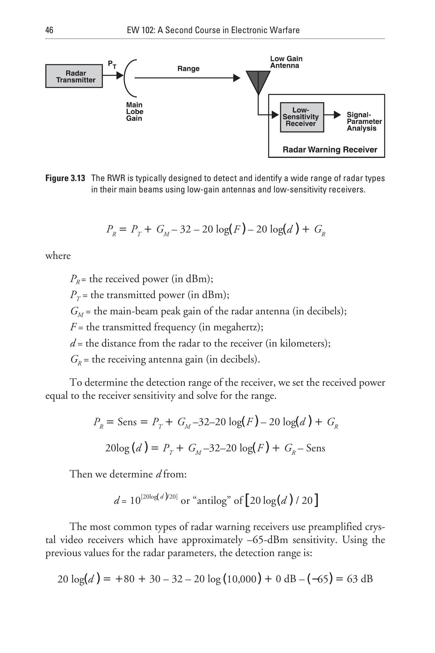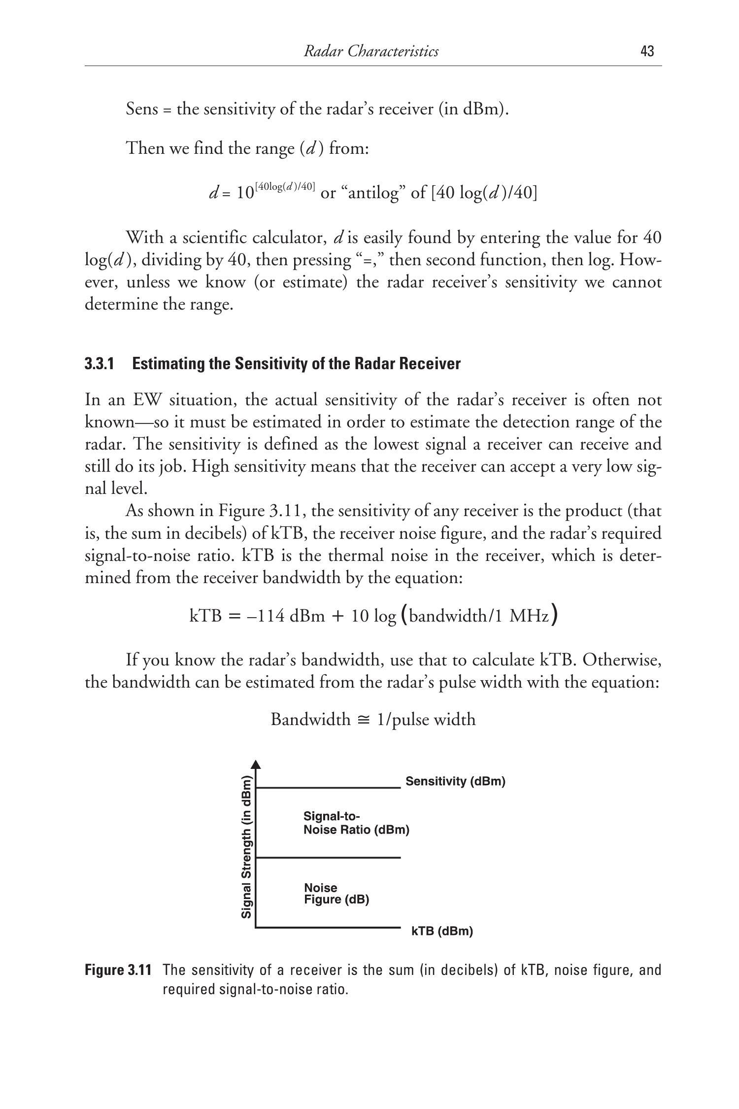 使用科学计算器时,只需输入 \(40 \log (d)\) 的值,除以40,然后按“=”,再按二次功能键和log,就能得到 \(d\)。然而,除非我们知道(或估计)雷达接收机的灵敏度,否则无法确定其探测距离。
