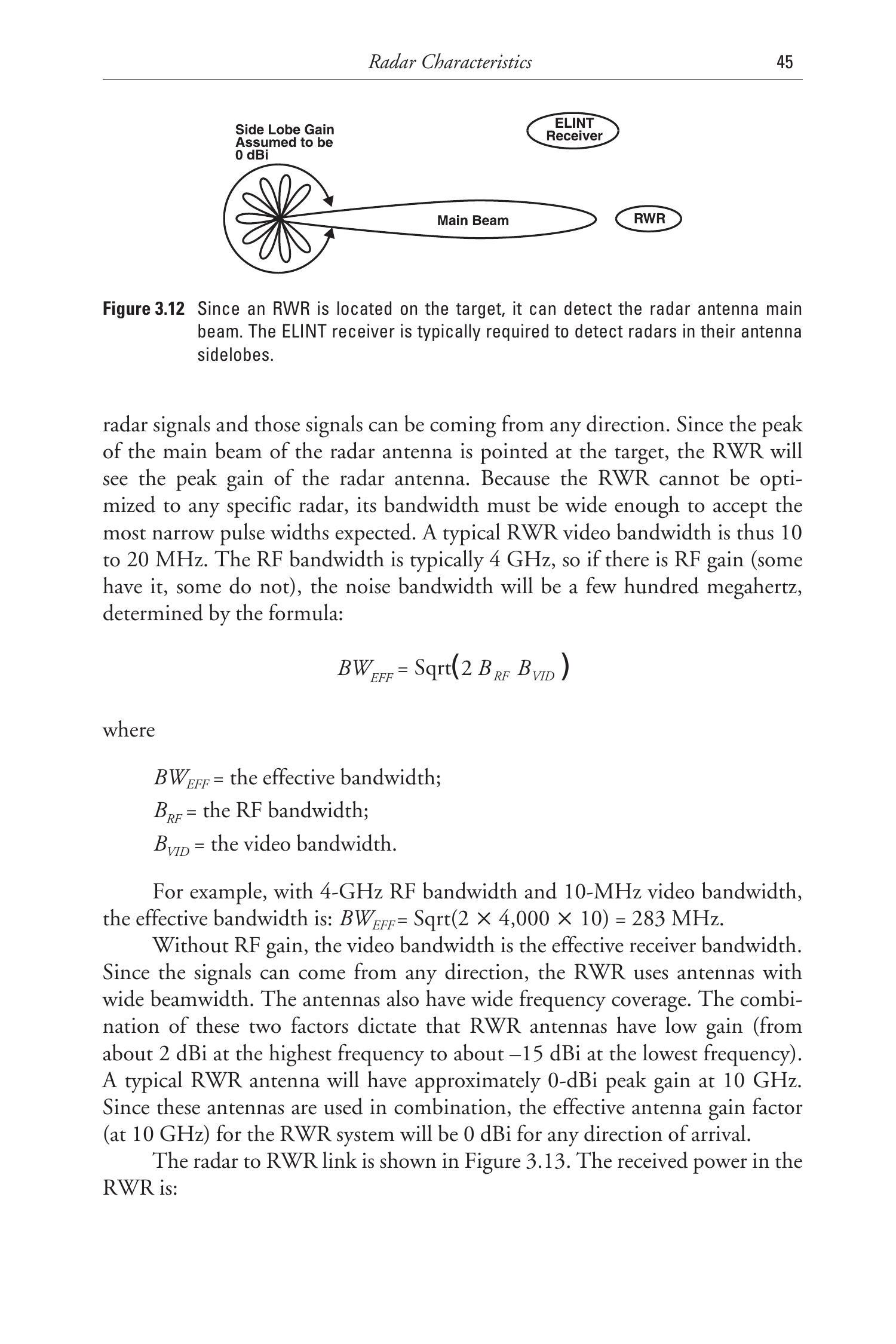 RWR 的设计目的是探测与威胁相关的雷达,以帮助保护目标免受这些威胁。它必须能够探测来自任意方向的多种雷达信号。由于雷达天线主瓣的峰值增益指向目标,RWR 将看到雷达天线的峰值增益。因为 RWR 无法针对某一特定雷达进行优化,其带宽必须足够宽,以接收预期中最窄的脉冲宽度。一个典型的 RWR 视频带宽为10至20 MHz。射频带宽通常为4 GHz,因此如果存在射频增益(部分有,部分没有),噪声带宽可由以下公式确定: