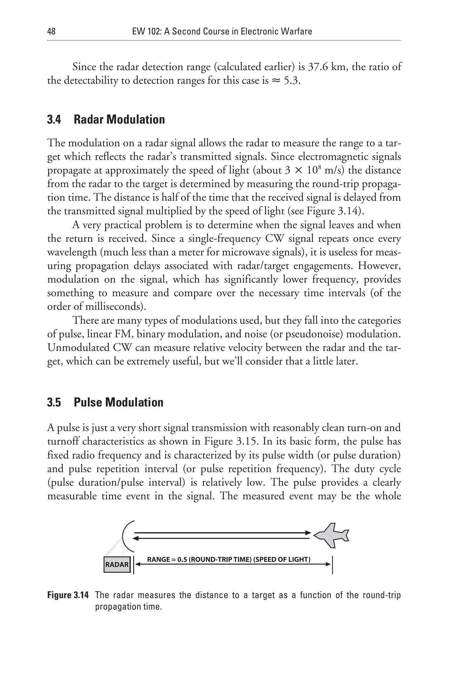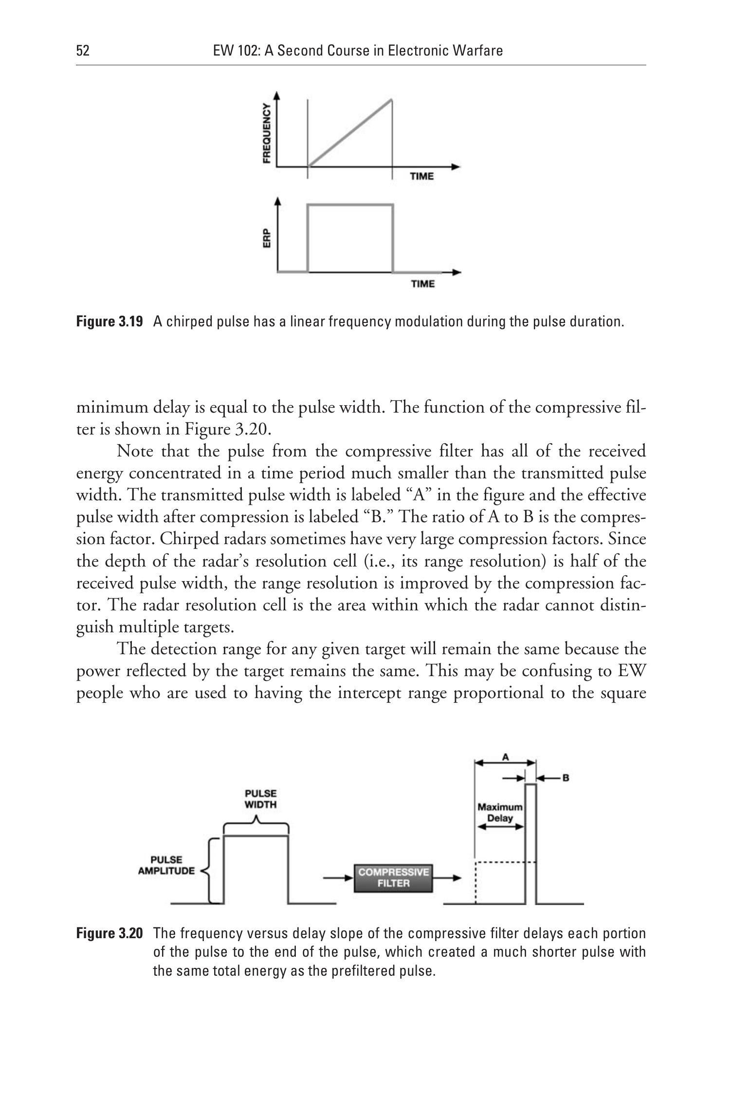 由于 ESM 接收机依赖雷达信号的峰值功率来探测信号,因此如果雷达使用低功率、长持续时间的调制信号并结合一定的调制技术(见图 3.39),则既能保持良好分辨率,又能获得更远的探测距离优势。