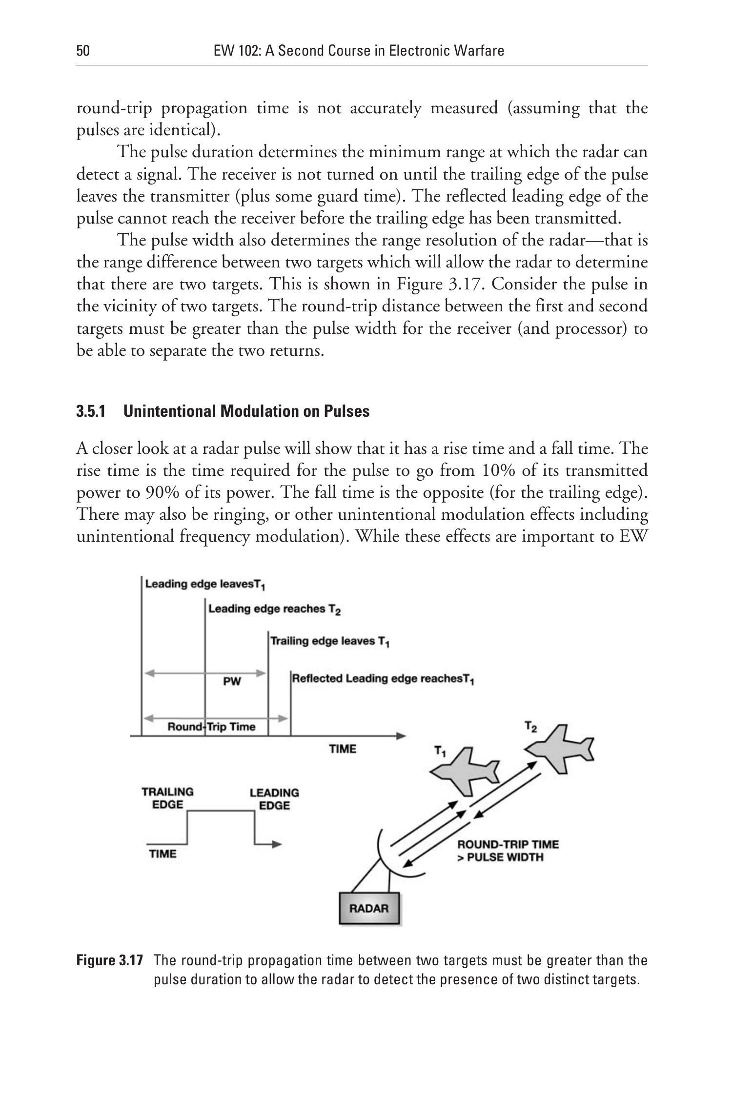 雷达接收机能获得带宽优势,是因为它可以将接收机和信号处理精确匹配到自身的发射信号上,而截获接收机必须接受各种不同类型的信号,并执行参数测量以识别信号种类。例如,脉冲雷达仅需确定脉冲往返时间,并可通过多脉冲积分实现测距,因此它对脉冲形状并不敏感,其有效带宽(包含处理增益)远小于脉冲宽度的倒数。而截获接收机必须测量脉冲宽度,这要求脉冲具有明确的前沿与后沿,因此接收机带宽至少需要为脉冲宽度倒数的 2.5 倍或更大(见图 3.41)。