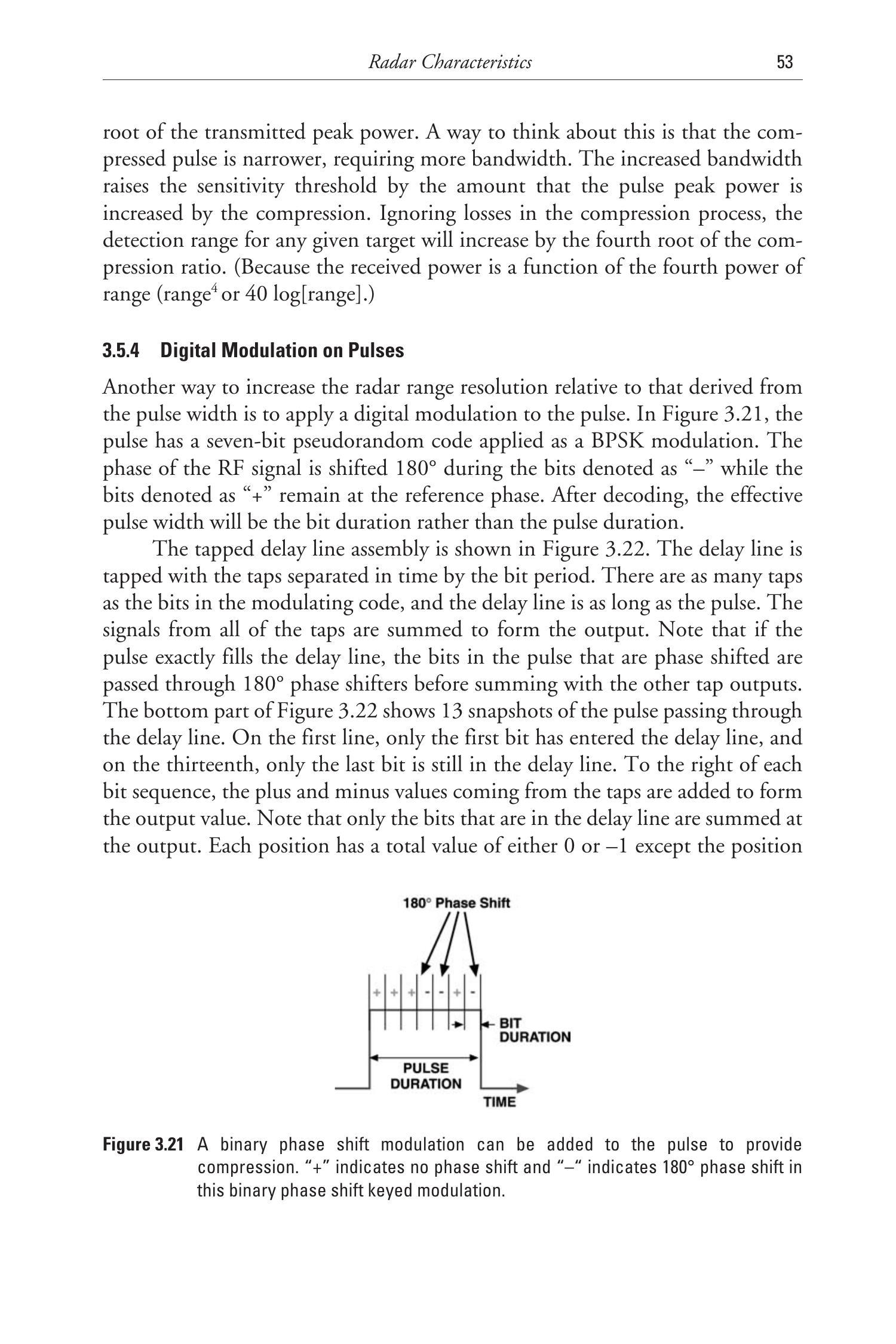 信号调制可以在给定信号持续时间下获得更好的距离分辨率。调制方式包括频率调制(啁啾)或相位反转(二进制相位键控,BPSK,见 3.5 节),还可以使用其他相位调制方式,如正交相位键控(QPSK)或更高阶相位调制(M 阶 PSK)。