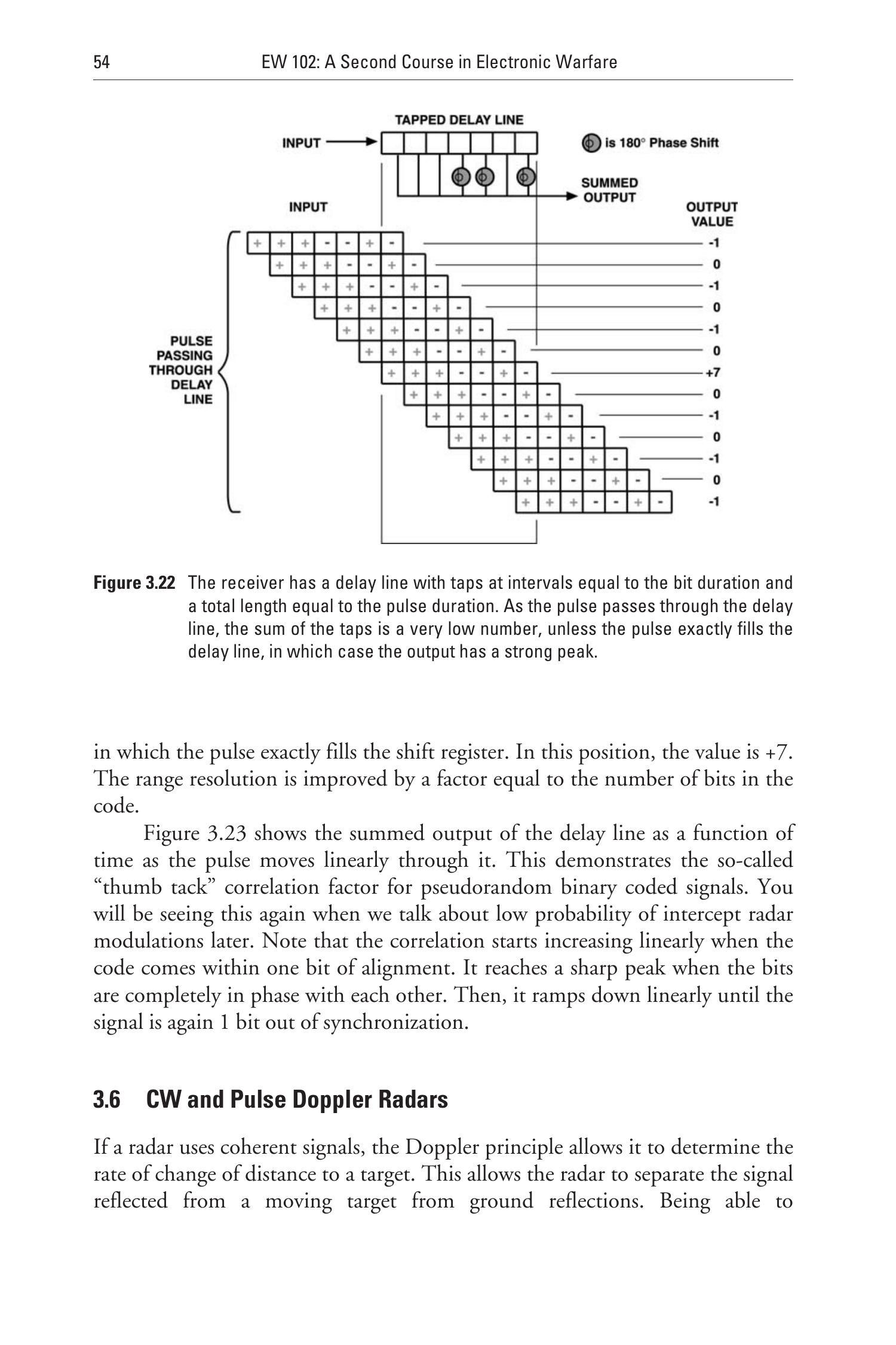 电子战接收机无法对雷达信号进行相干检测,而 LPI 雷达可以做到这一点,因为发射机与接收机通常处于同一平台。当信号调制中引入随机性时,这一优势更加明显。最极端的例子是用真正的噪声对雷达信号进行调制。使用噪声调制的 LPI 雷达被称为随机信号雷达(RSR)。RSR 使用多种技术将返回信号与已延迟的发射信号进行相关,如图 3.42 所示。使相关输出达到峰值所需的延迟量即为目标距离。由于发射信号是完全随机的,截获接收机无法进行相关处理,只能通过能量检测手段检测信号的存在,无法获取调制信息。这种检测方式远不如雷达接收机所采用的相关处理效率高。