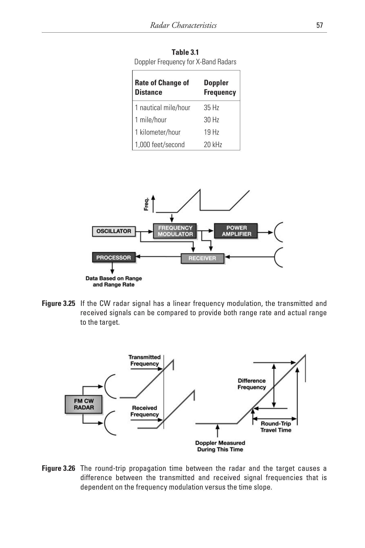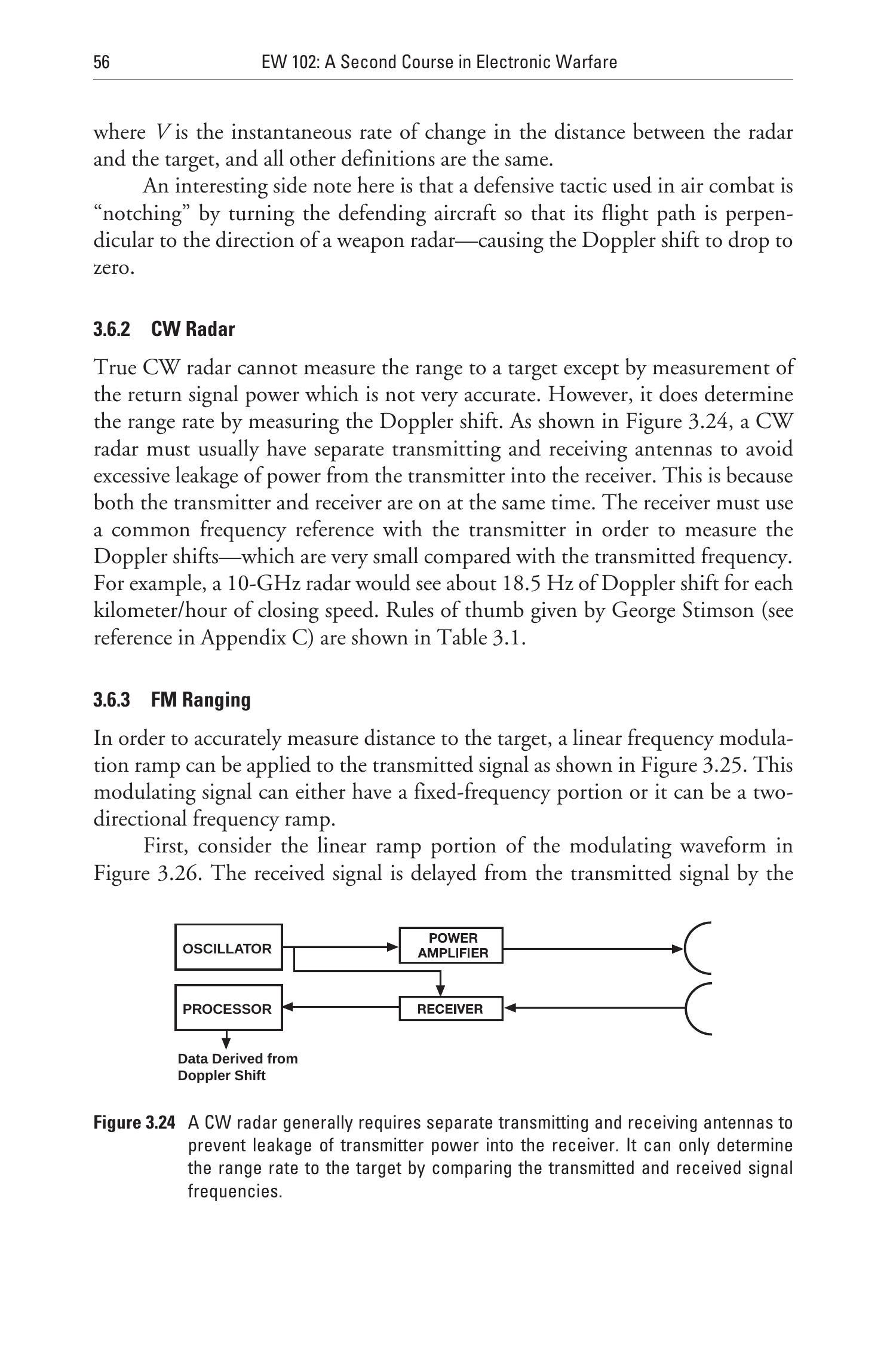 图3.3是连续波(CW)雷达的框图。它与脉冲雷达的不同在于其信号始终存在。这意味着它必须有两个天线,因为在发射的同时需要接收极其微弱的回波。两个天线必须具有足够的隔离度,以防止发射信号使接收机饱和。接收机将接收信号的频率与发射频率进行比较,以确定由目标相对速度引起的多普勒频移。发射机还可以加调制,以允许测量距离。处理器执行目标跟踪和天线控制功能,并像脉冲雷达一样与控制和显示接口。