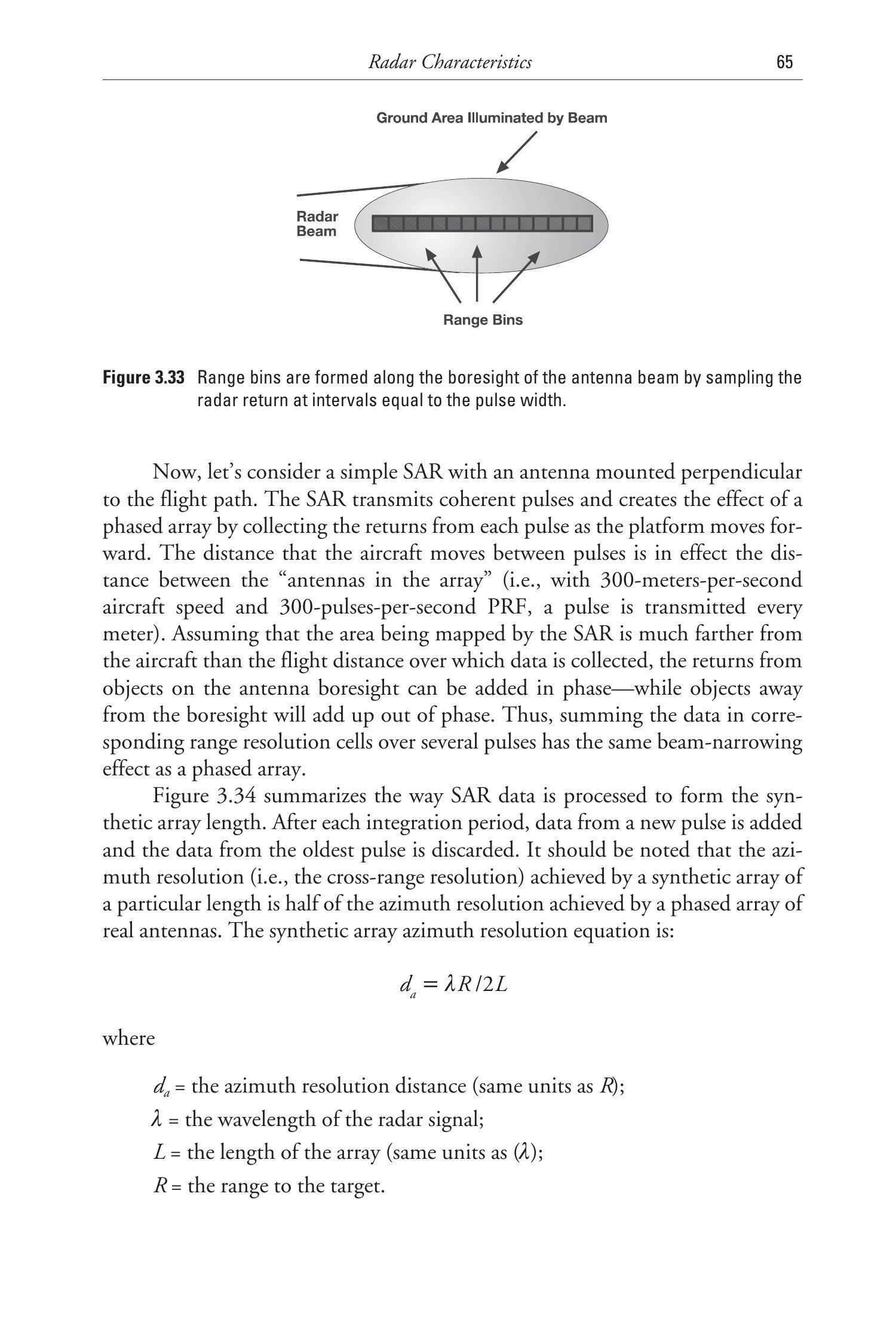 图 3.34 总结了 SAR 数据如何累加形成合成阵列长度。每完成一次积分周期,就添加一个新脉冲的数据并丢弃最早的数据。需要注意的是,特定长度的合成阵列所获得的方位分辨率是实阵列的一半。SAR 的方位分辨率计算公式为: