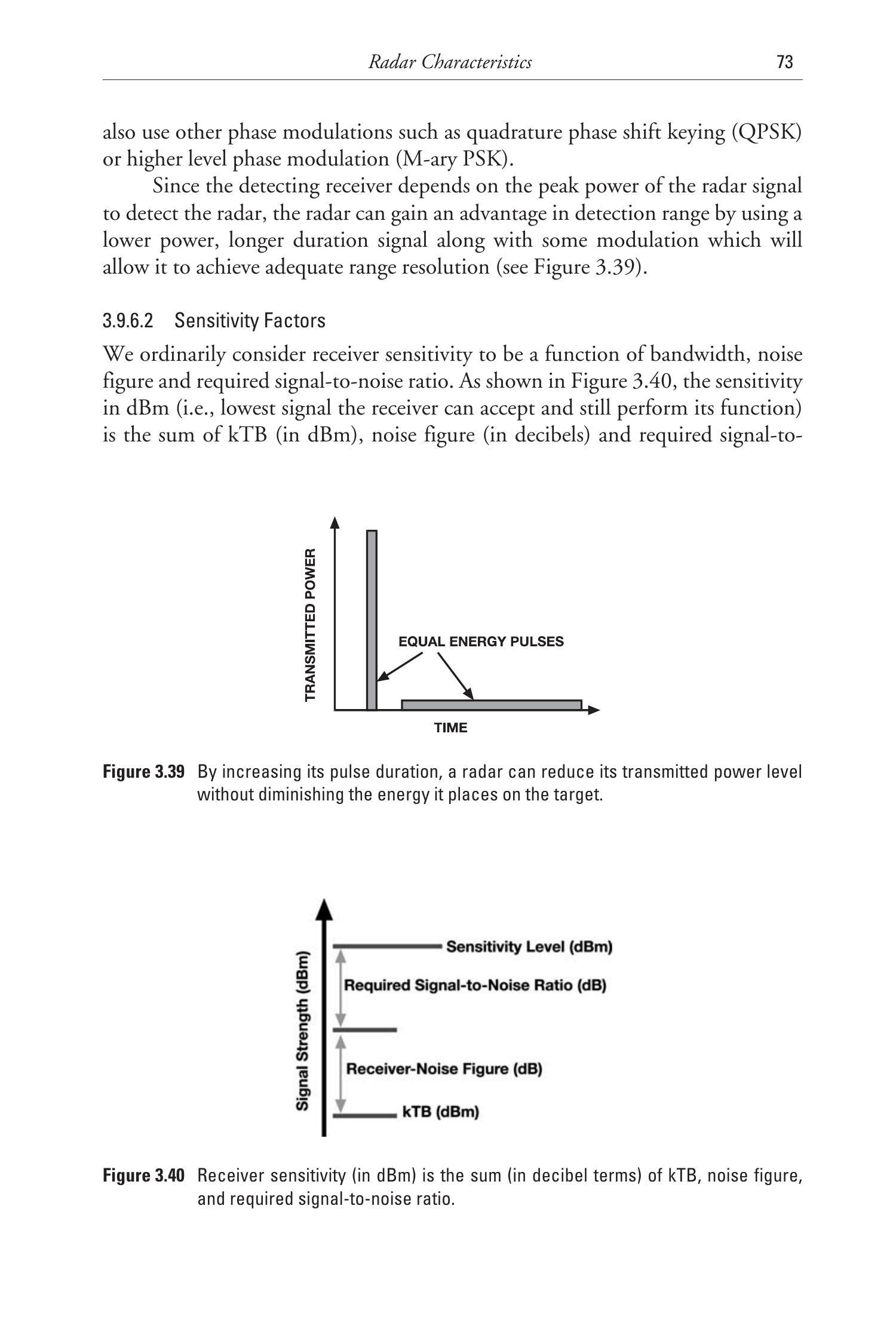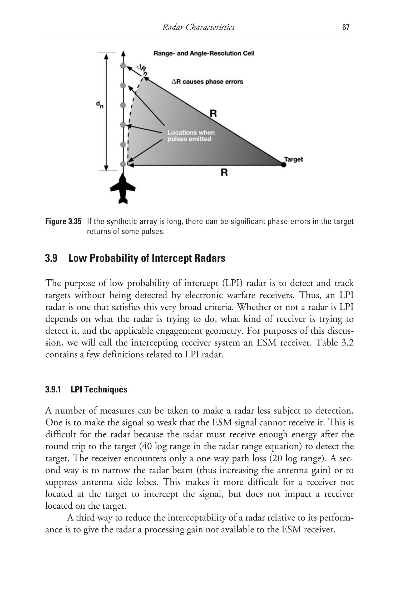这些公式适用于图 3.37 和图 3.38 中的情况。通过代入实际值并设定带宽和处理增益(影响灵敏度),可以用于分析 LPI 雷达在真实场景中的表现。