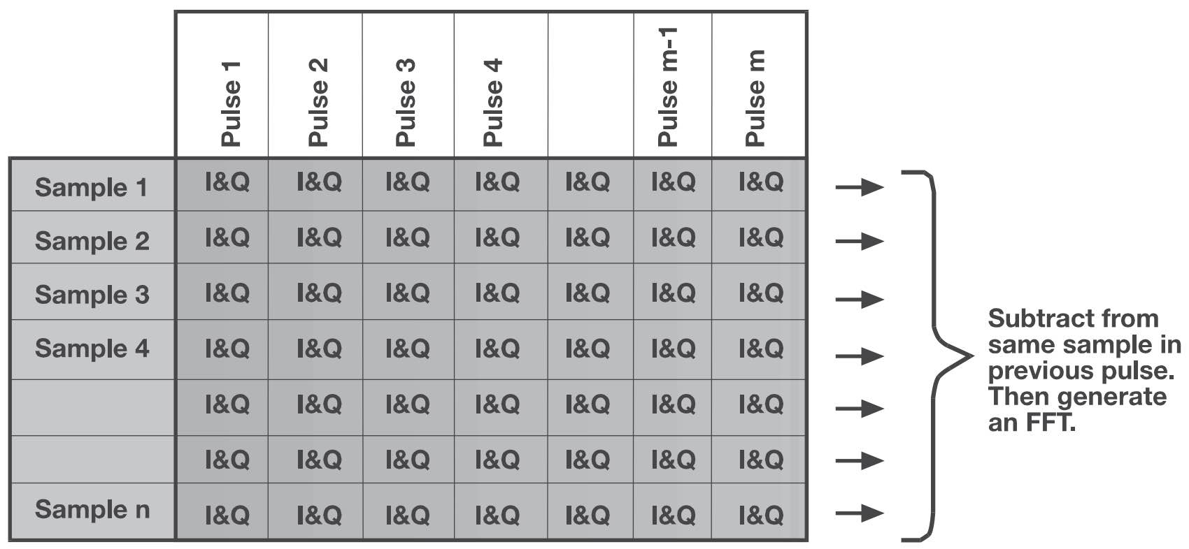 图 3.34:每个距离单元在每个脉冲中采集 I\&Q 样本,并将多个脉冲中相同距离单元的数据累加以形成方位分辨能力。