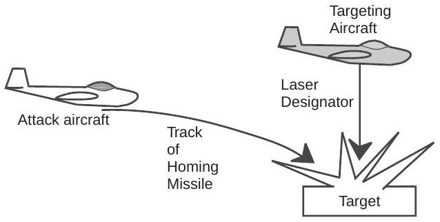 图4.29 一架空中平台将激光指示器对准目标,使另一平台发射的导弹能够追踪来自目标的散射。