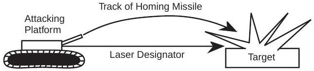 图4.30展示了地对地激光指示攻击的情况。攻击平台将激光指示器对准目标,并发射自身的激光制导导弹。整个交战过程中必须保持视距,以确保指示器持续照射目标。然而,在某些系统中,导弹本身携带激光,这使得即使目标机动以规避攻击平台的视距,攻击仍可继续。需要注意的是,攻击平台上的激光测距仪可提供极其精确的目标距离,从而生成非常紧凑的射击解算,这会使任何对抗措施更加困难。