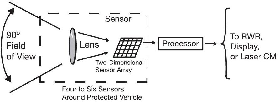 对抗激光制导武器的第一步是确认目标资产上是否已被激光指示器照射。这需要使用激光探测系统,如图4.31所示,广泛应用于地面机动平台和空中平台。这些系统通常在平台周围分布有四个或六个传感器。由于每个传感器覆盖 \(90^{\circ}\) 的方位角,因此四个传感器可提供 \(360^{\circ}\) 的全方位覆盖,以及大约 \(\pm 45^{\circ}\) 的俯仰覆盖,这通常对地面车辆已足够。飞机通常配置六个传感器,提供近似球形(4球面度)的覆盖。