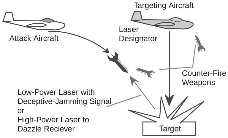如果低功率激光携带欺骗性干扰信号,使导弹接收器传递错误的角误差信号至制导系统,导弹便可能偏离目标。