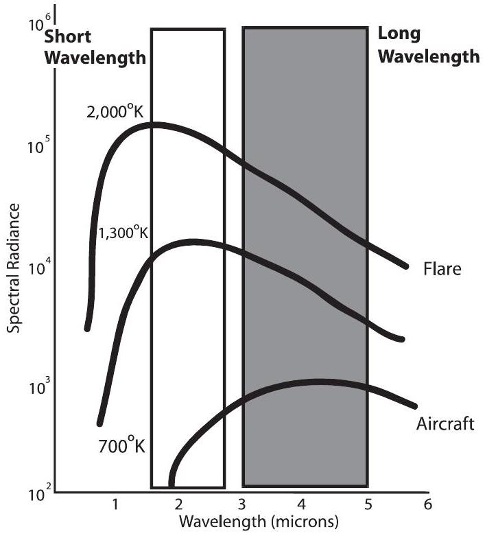 一般而言,高温目标大多在近红外波段发出最多能量,例如喷气发动机尾向(从后部观察)区域。太阳发出的红外能量也主要集中在近红外。稍冷一些的目标(如发动机外部热金属部件、喷口尾焰)主要发射中红外。常温物体(如飞机外壳、车辆、云层与地球表面)则主要发射远红外。