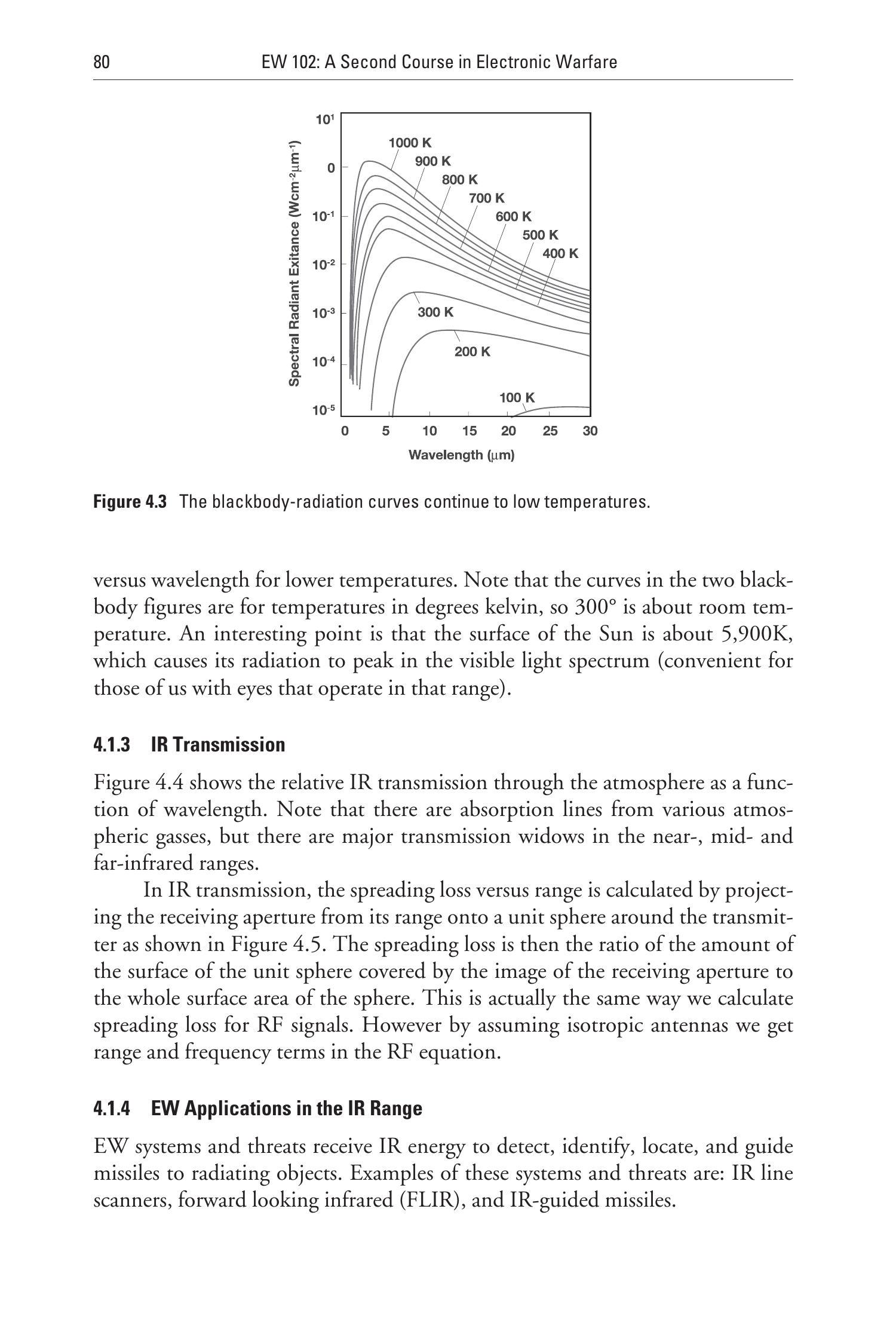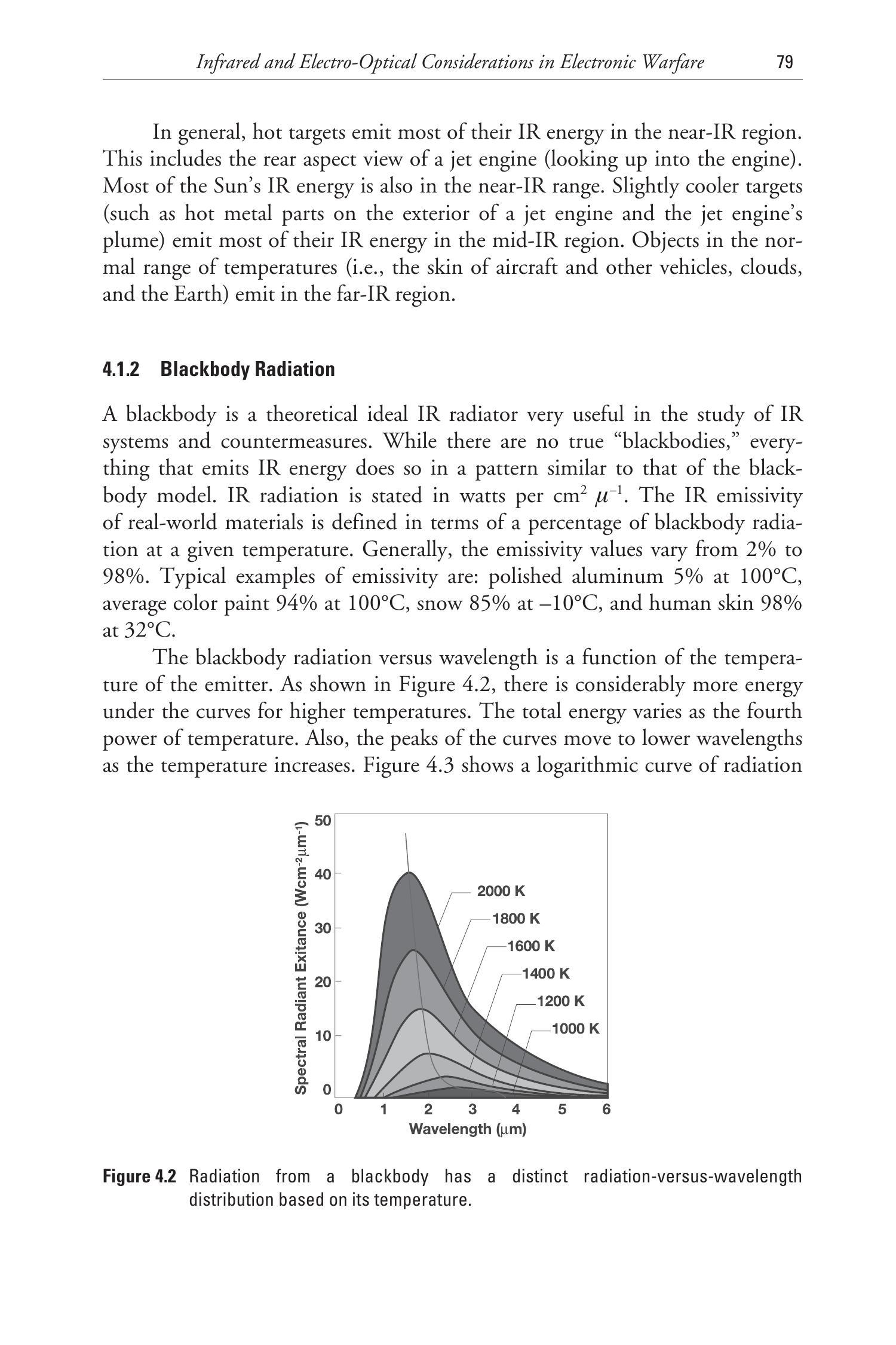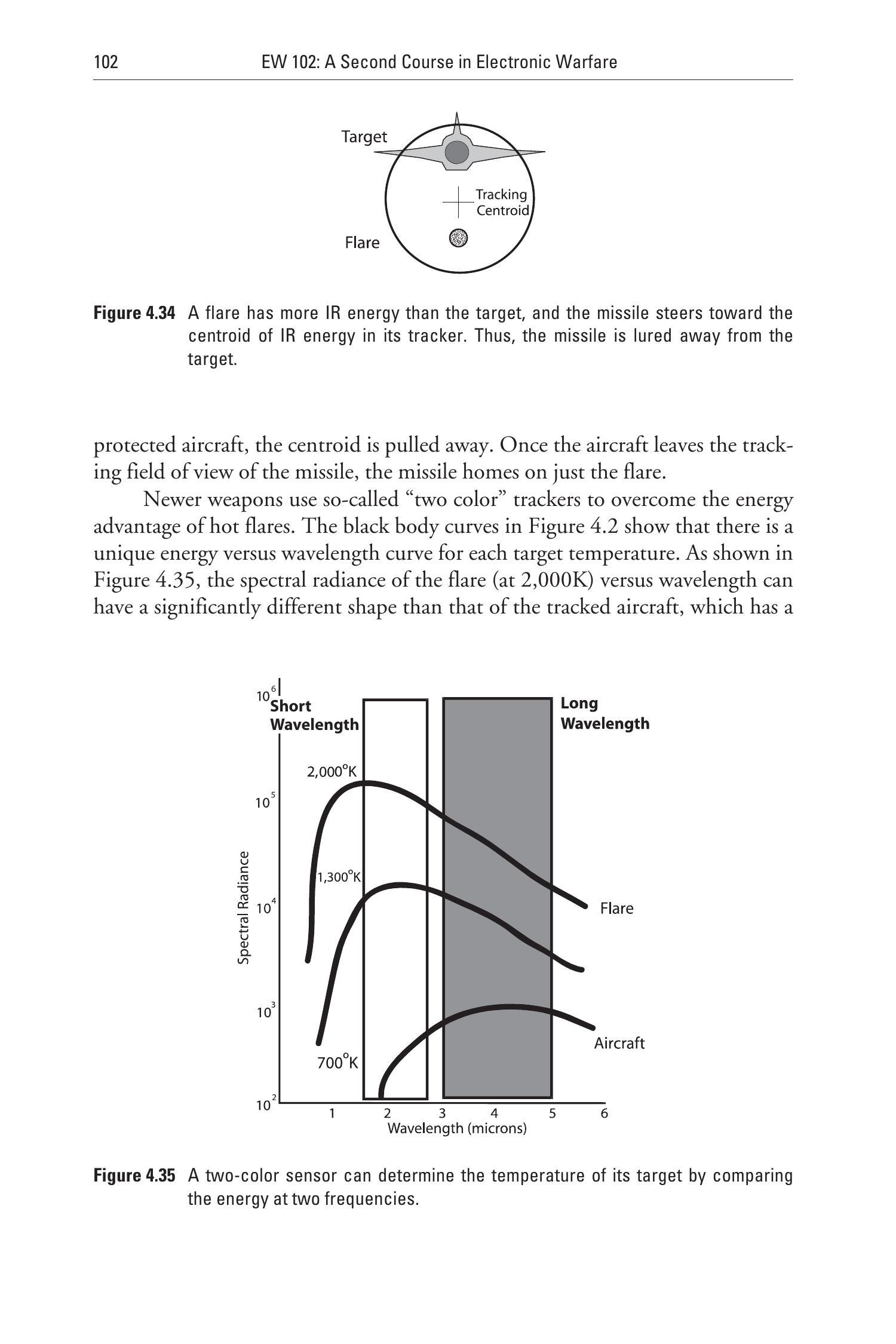 新型武器使用所谓的“双波段”跟踪器来克服高温干扰弹的能量优势。图4.2中的黑体曲线表明,不同温度目标都有唯一的能量与波长关系曲线。如图4.35所示,温度为 \(2,000 \mathrm{~K}\) 的干扰弹的光谱辐射随波长的分布与温度较低的被跟踪飞机显著不同。通过在两个波长(即两个颜色)上测量并比较能量,传感器实际上能够确定所跟踪目标的温度。双波段跟踪技术可以区分出更热的干扰弹并继续跟踪真正的目标。这显著增加了对抗措施的复杂性。为了欺骗双波段跟踪器,必须使用在正确温度下的大型抛弃物,或采用其他方法欺骗导弹传感器,使其在两个测量波长上接收到正确的能量比值。