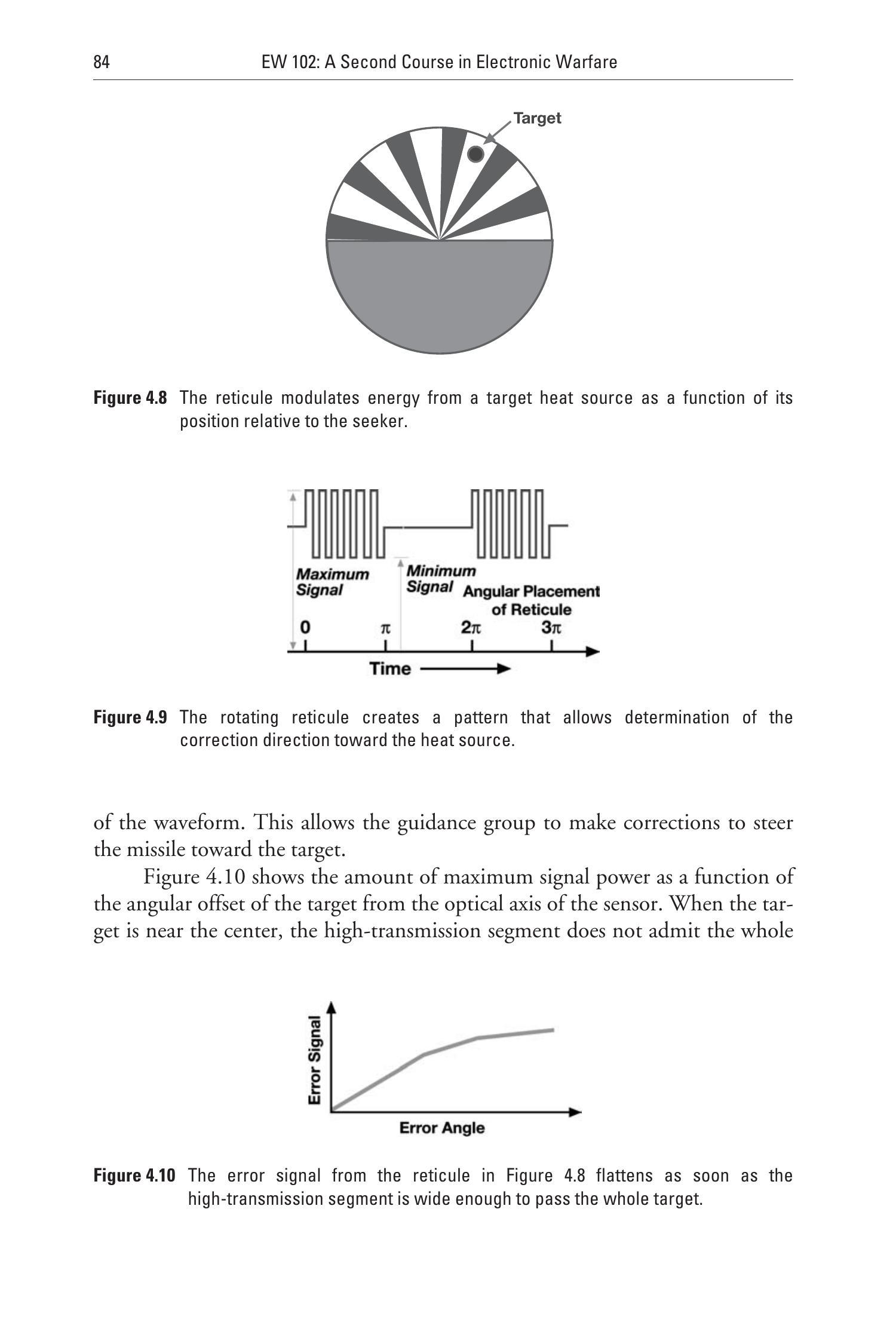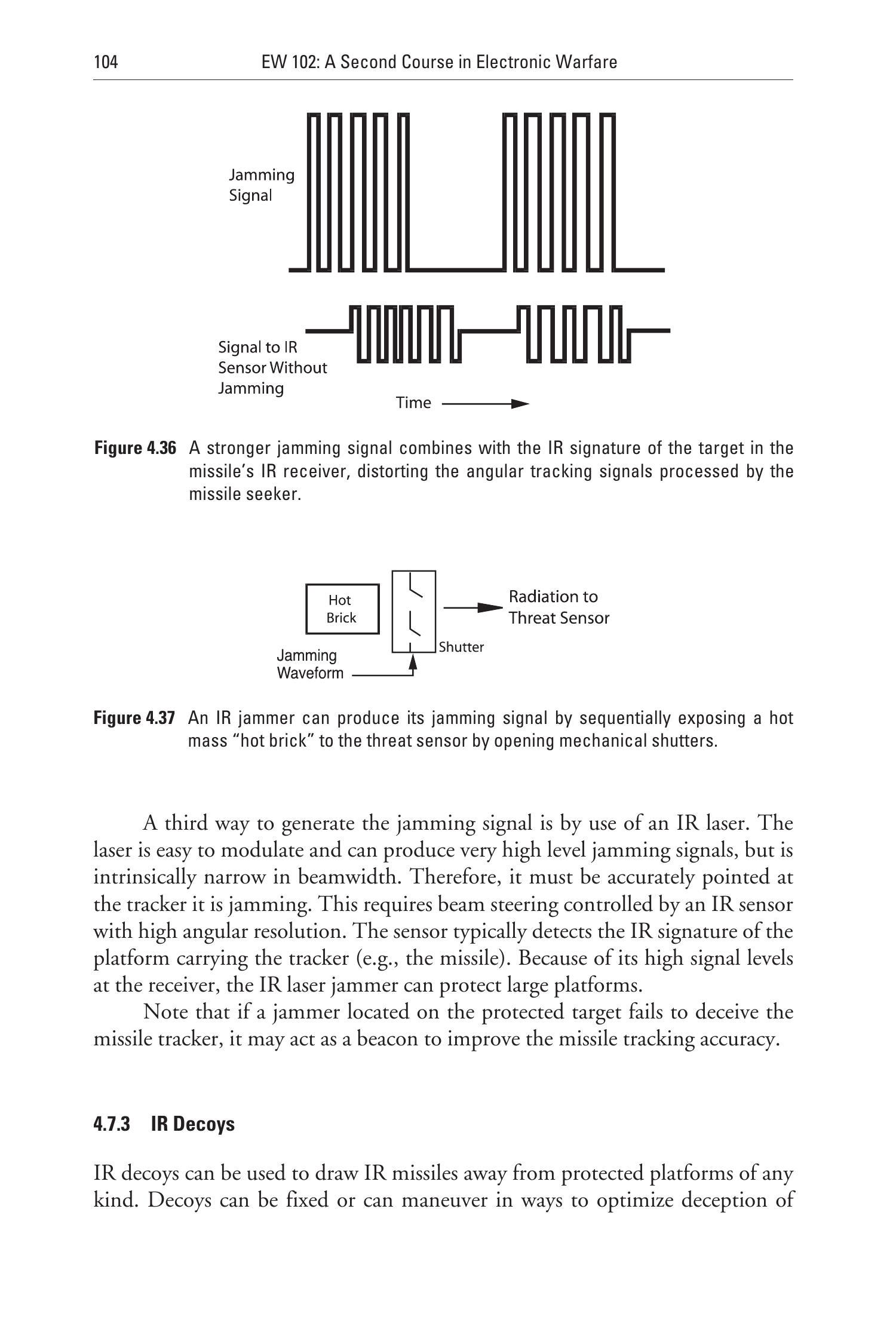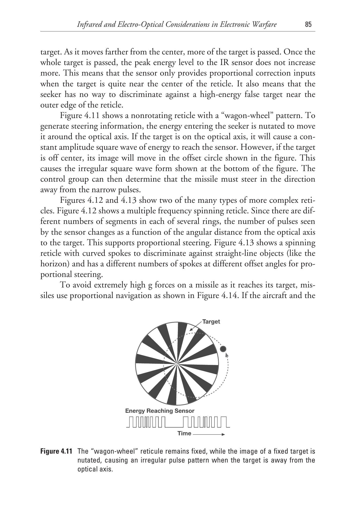 一旦确定了导弹跟踪信号,红外干扰机就能产生如图4.36所示的错误脉冲模式,使导弹跟踪信号产生错误的转向指令,这与欺骗性射频干扰机的效果类似。在没有特定攻击导弹的直接跟踪信息时,也可以生成并发射通用的虚假跟踪信号。