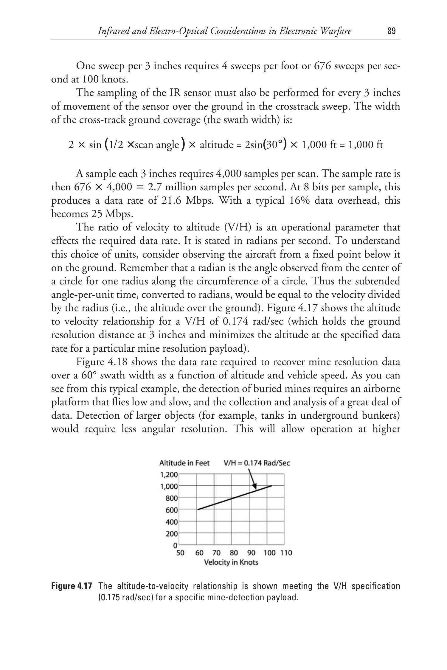 平台速度与高度之比 \((V/H)\) 是一个关键操作参数,单位为 \(\mathrm{rad/sec}\)。从地面观察飞行器,\(V/H\) 即为单位时间内的视角变化速率。图 4.17 显示在 \(V/H = 0.174\ \mathrm{rad/sec}\) 条件下,不同速度-高度组合的对应关系,该值可在限定的数据速率和地雷分辨精度下提供最小飞行高度。