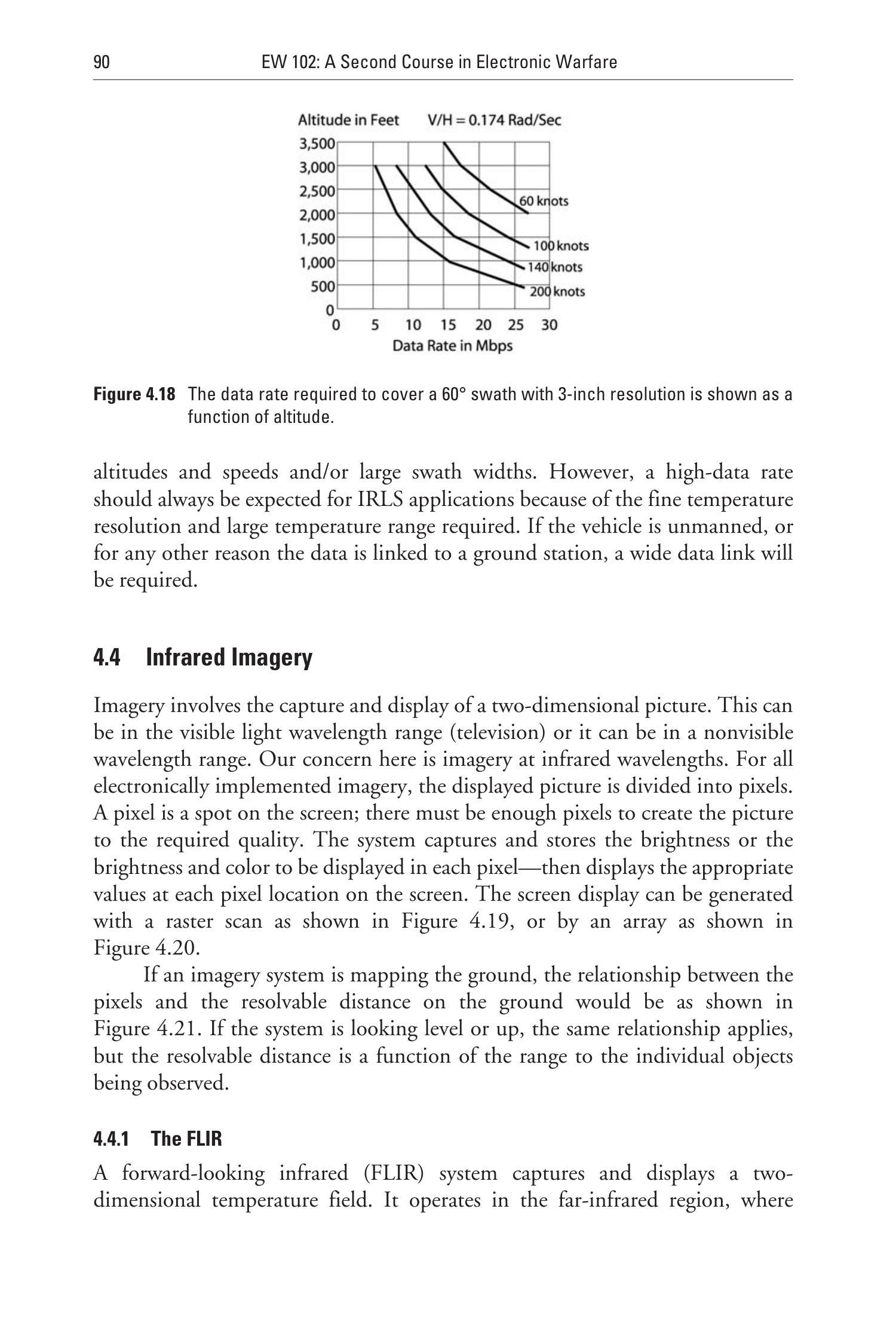 图 4.18 显示了在 \(60^\circ\) 扫描宽度下,以 3 英寸分辨率扫描所需数据速率与平台高度、速度的关系。由此可见,地雷探测任务需低空低速平台,并需处理大量数据。若探测目标尺寸较大(如地堡内坦克),则角分辨率要求降低,可允许更高的飞行高度与速度,或更宽的扫描范围。但由于红外温度范围大、分辨精度高,IRLS 应用总是伴随着高数据率需求。若为无人机平台或需远程传输,需配置高带宽的数据链路。