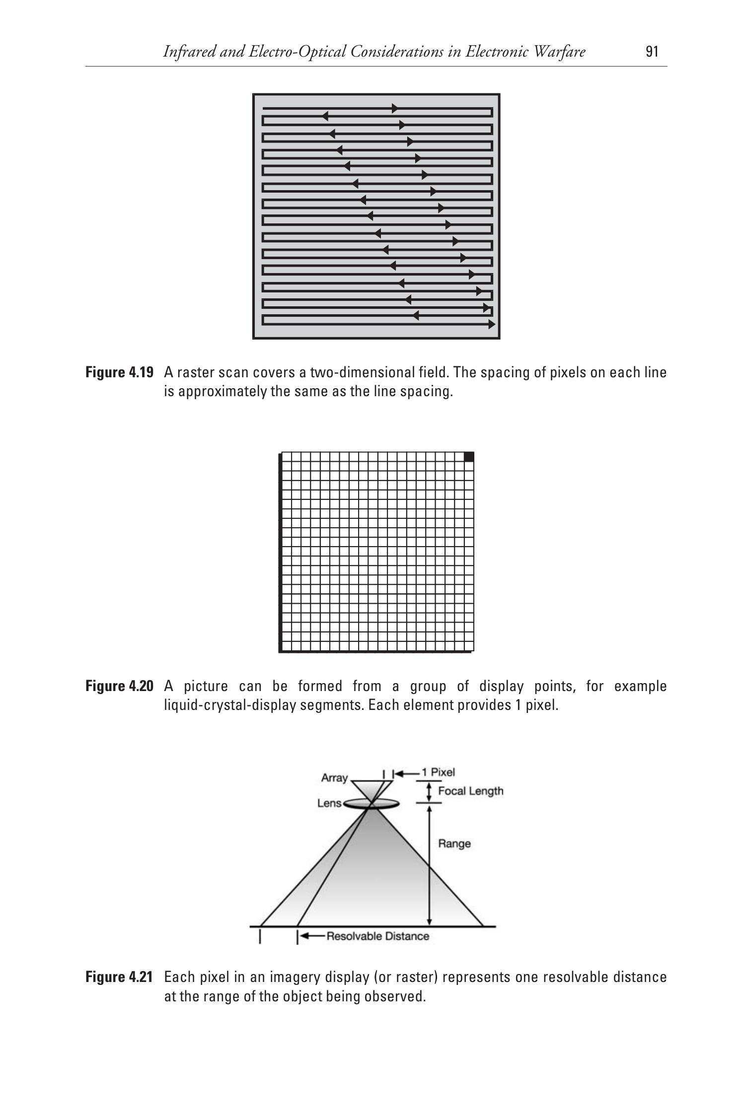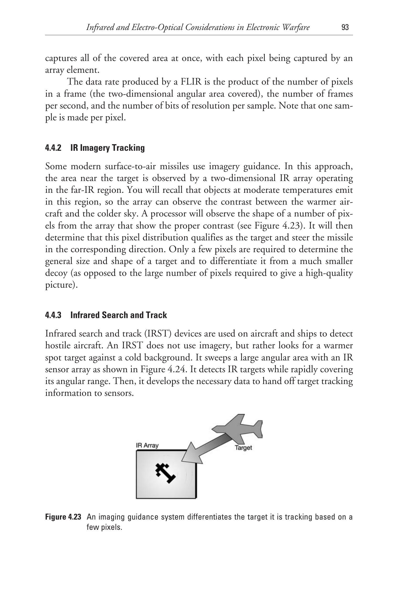 处理器将识别阵列中多个具有特定热对比的像素(见图 4.23),判断其分布是否构成目标,并据此引导导弹飞向目标方向。只需少量像素就可确定目标的大致大小和形状,并区分其与较小的诱饵(相比高质量图像所需的像素数量)。