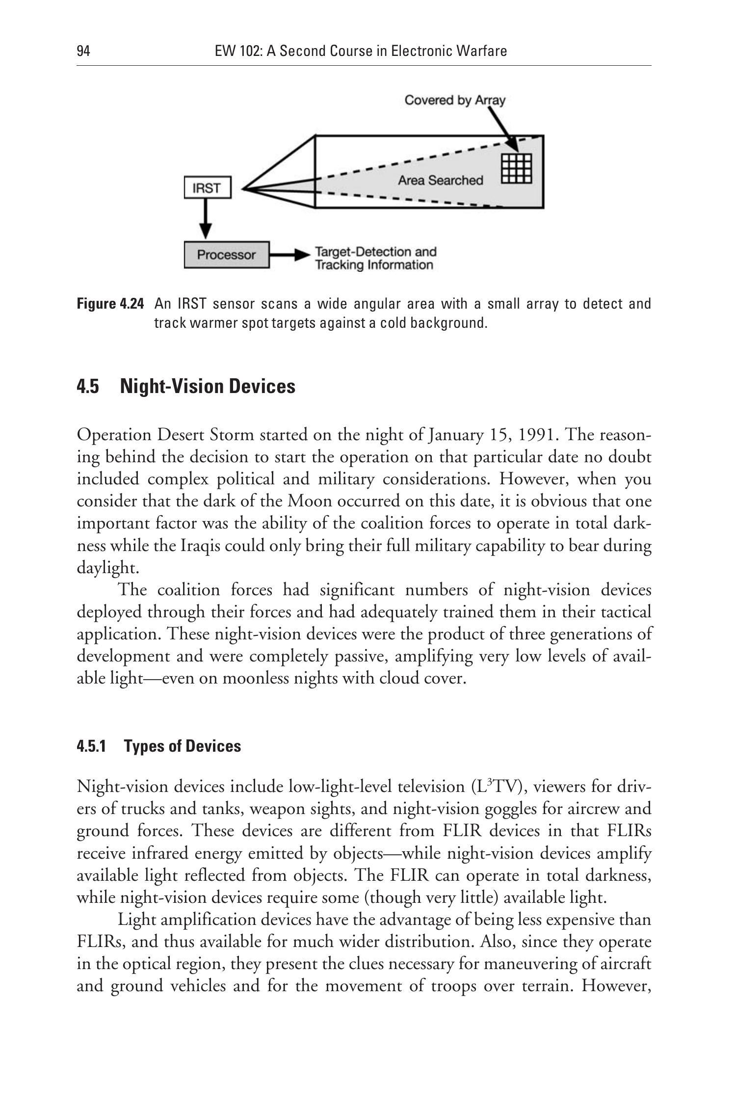 本节将 IR 与光电(EO)设备做出一定区分,目的在于从研究范围中单独抽出那些接收辐射红外能量的设备。其中一些 EO 设备也工作在红外光谱范围内。本章讨论的 EO 系统与应用(及其对抗手段)包括: