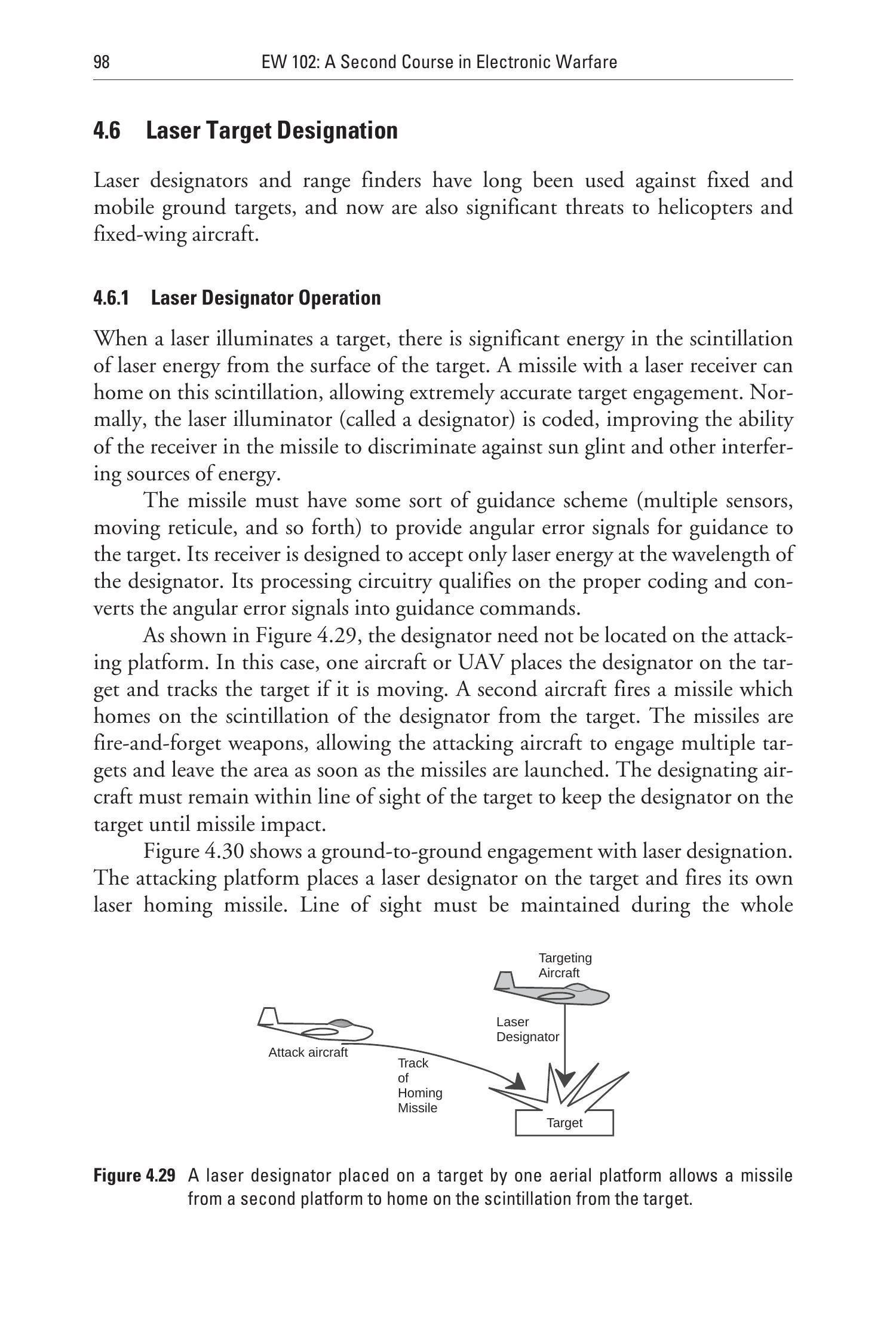 图4.30展示了地对地激光指示攻击的情况。攻击平台将激光指示器对准目标,并发射自身的激光制导导弹。整个交战过程中必须保持视距,以确保指示器持续照射目标。然而,在某些系统中,导弹本身携带激光,这使得即使目标机动以规避攻击平台的视距,攻击仍可继续。需要注意的是,攻击平台上的激光测距仪可提供极其精确的目标距离,从而生成非常紧凑的射击解算,这会使任何对抗措施更加困难。