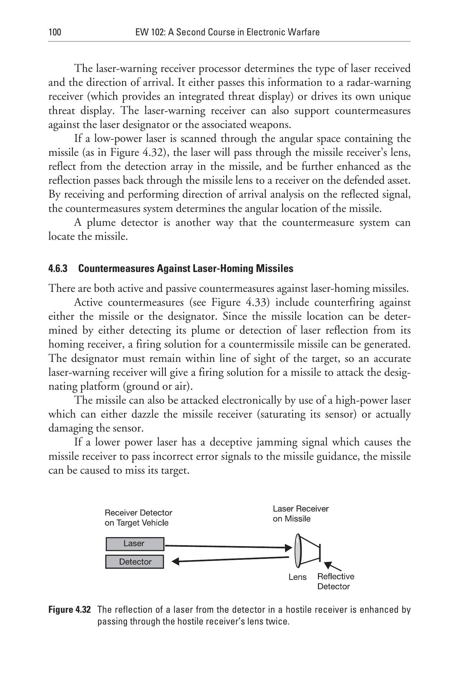 如果低功率激光在包含导弹的角空间中扫描(如图4.32所示),激光会透过导弹接收器的透镜,反射自导弹探测阵列,并在反射信号再次通过导弹透镜时进一步增强,最终被防御平台上的接收机接收。通过接收并进行到达方向分析,对抗系统可确定导弹的角位置。