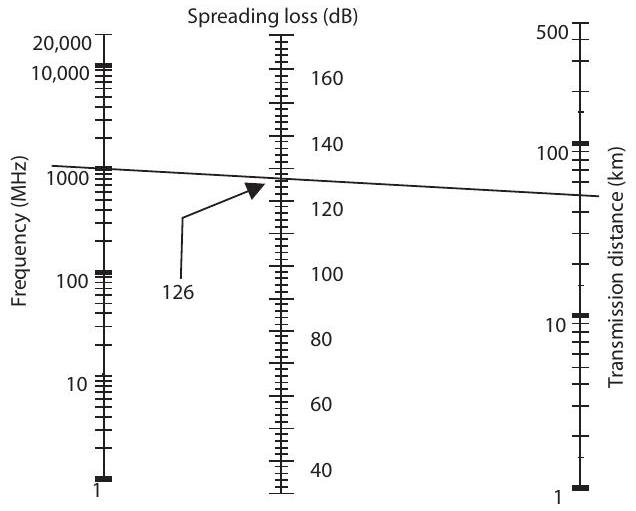 该直线与中心刻度(扩散损耗,单位:dB)相交于 126 dB 处。