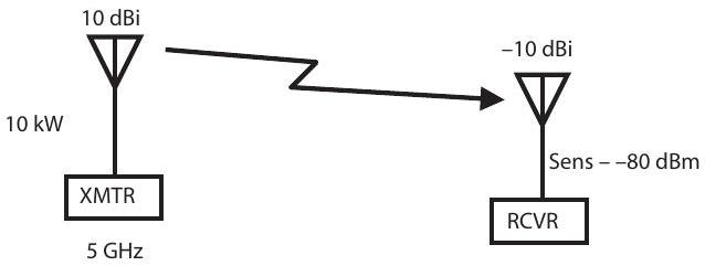 问题101-6: 求一个接收机在灵敏度为 -80 dBm、接收天线在指向发射机方向上的增益为 -10 dBi 时,能够接收到来自一台 \(5-\mathrm{GHz}\)、发射功率 \(100-\mathrm{kW}\)、天线在指向接收机方向上的增益为 10 dB 的发射机信号的最大距离。
