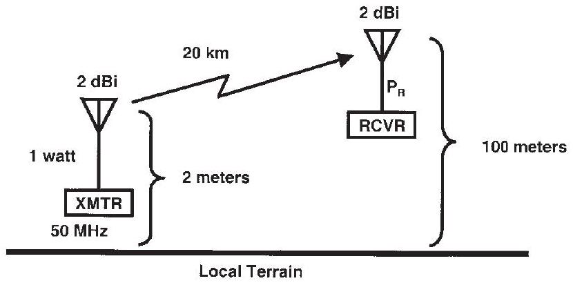 问题101-12: 一台 \(1-\mathrm{W}\)、\(50-\mathrm{MHz}\) 的发射机,天线增益为 2 dB,天线高度 2 m;接收机天线高度为 100 m,天线增益为 2 dB,距离 20 km。求接收机的接收功率。