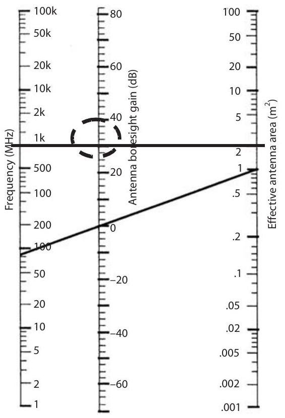 & \mathrm{G} / \mathrm{T}_{\mathrm{S}}=31,622 / 900=35.1 \quad \text { which is } 15.5 \mathrm{dBi} / \mathrm{K} \\