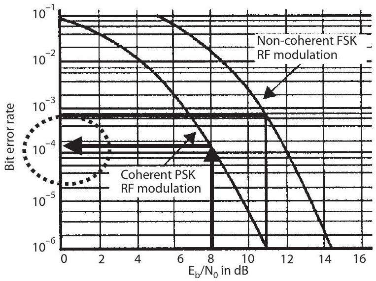 E_{b} / N_{0}(\mathrm{~dB})=\mathrm{RFSNR}+10 \log (\text{bandwidth}/\text{bit rate})=22\ \mathrm{dB}+10 \log (20\mathrm{k}/10\mathrm{k})=22+3=25\ \mathrm{dB}