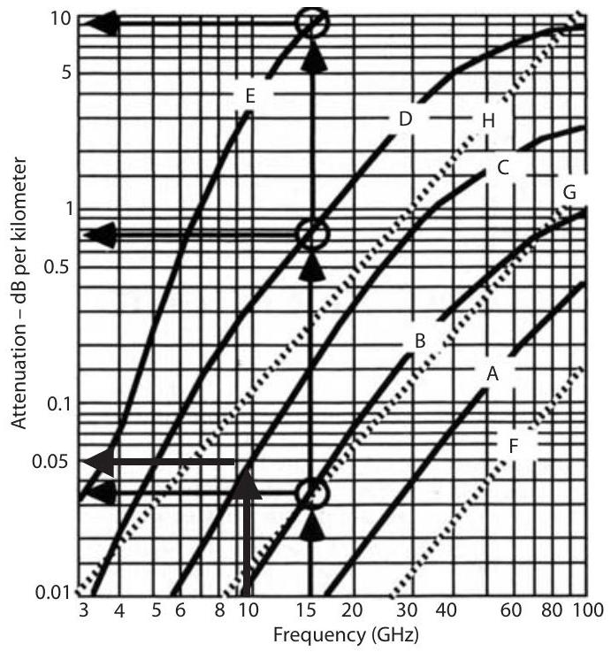 从横坐标(对数刻度)上取频率 15 GHz。注意这是对数刻度,因此 15 大约位于 10 与 20 之间的 0.7 处。向上找到曲线,再向左投影到纵坐标。读数为每公里 0.04 dB。