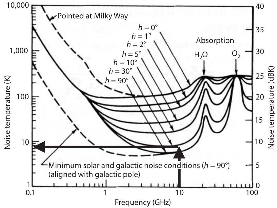 从图 7.2 中确定天线温度。在横坐标 10 GHz 处向上画线至 30° 仰角曲线,再向左到纵坐标,读取天线温度(8 K)。
