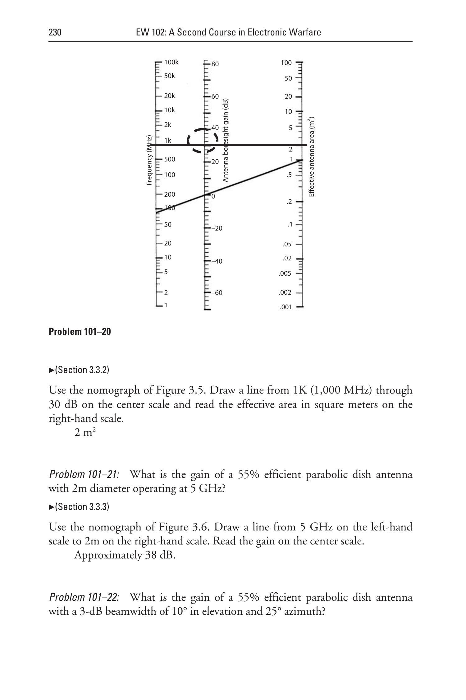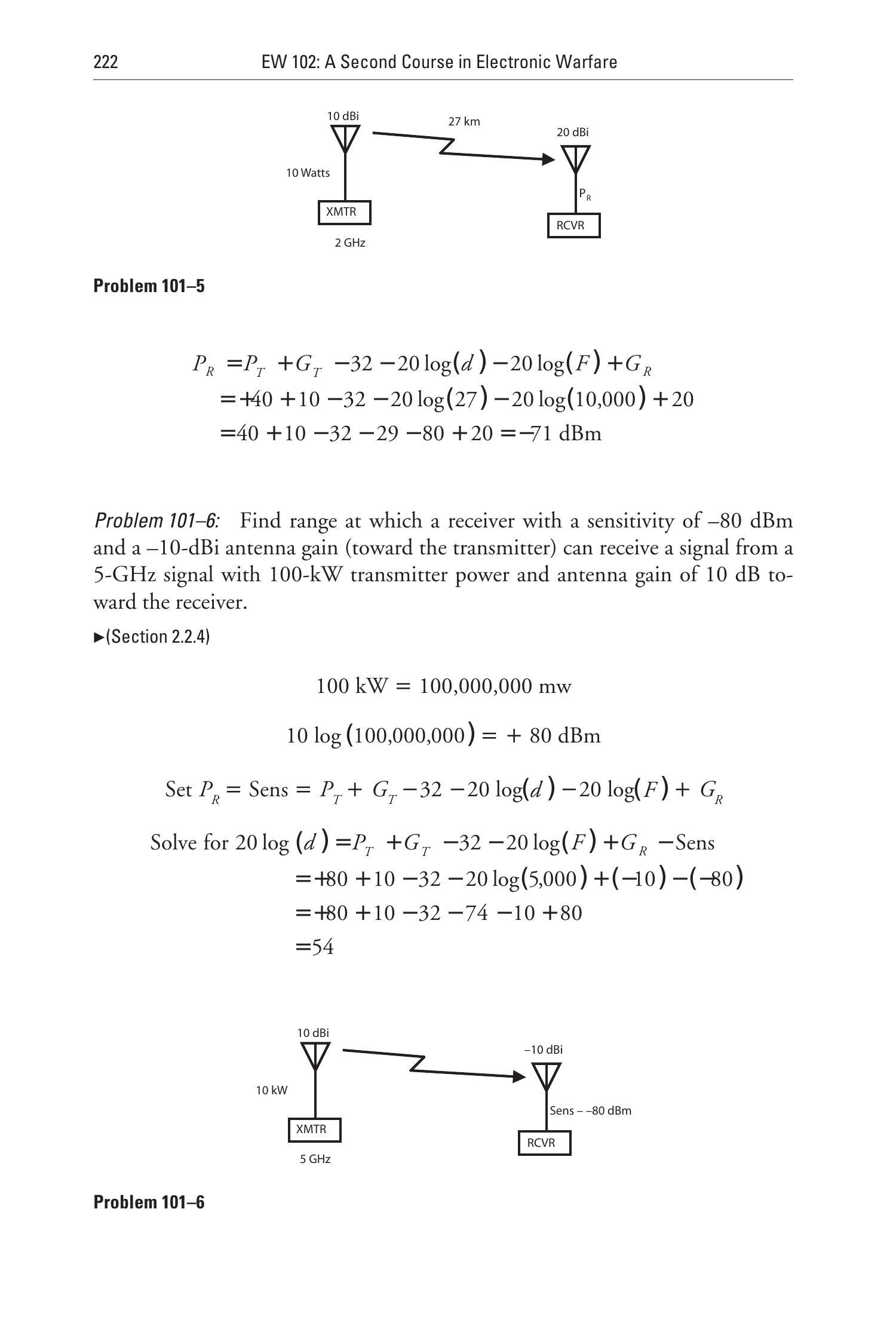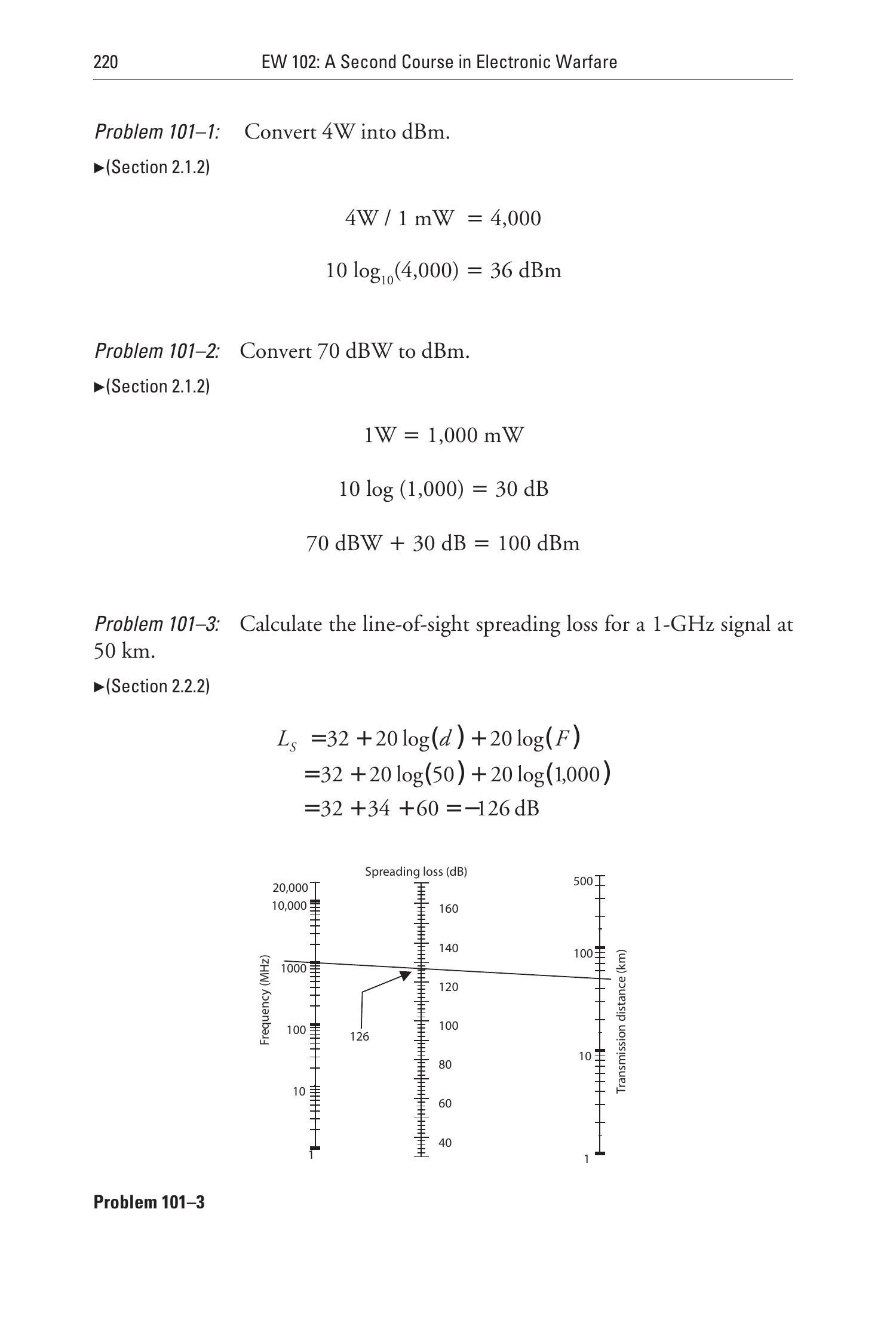 为响应众多请求,本附录收录了来自《EW 101》和《EW 102》两本书中的问题。每个问题的解答均以 \(1-\mathrm{dB}\) 的分辨率计算,并使用相应的公式形式。当需要使用教材中的诺模图或图表时,将其复制并展示如何利用其求解问题。