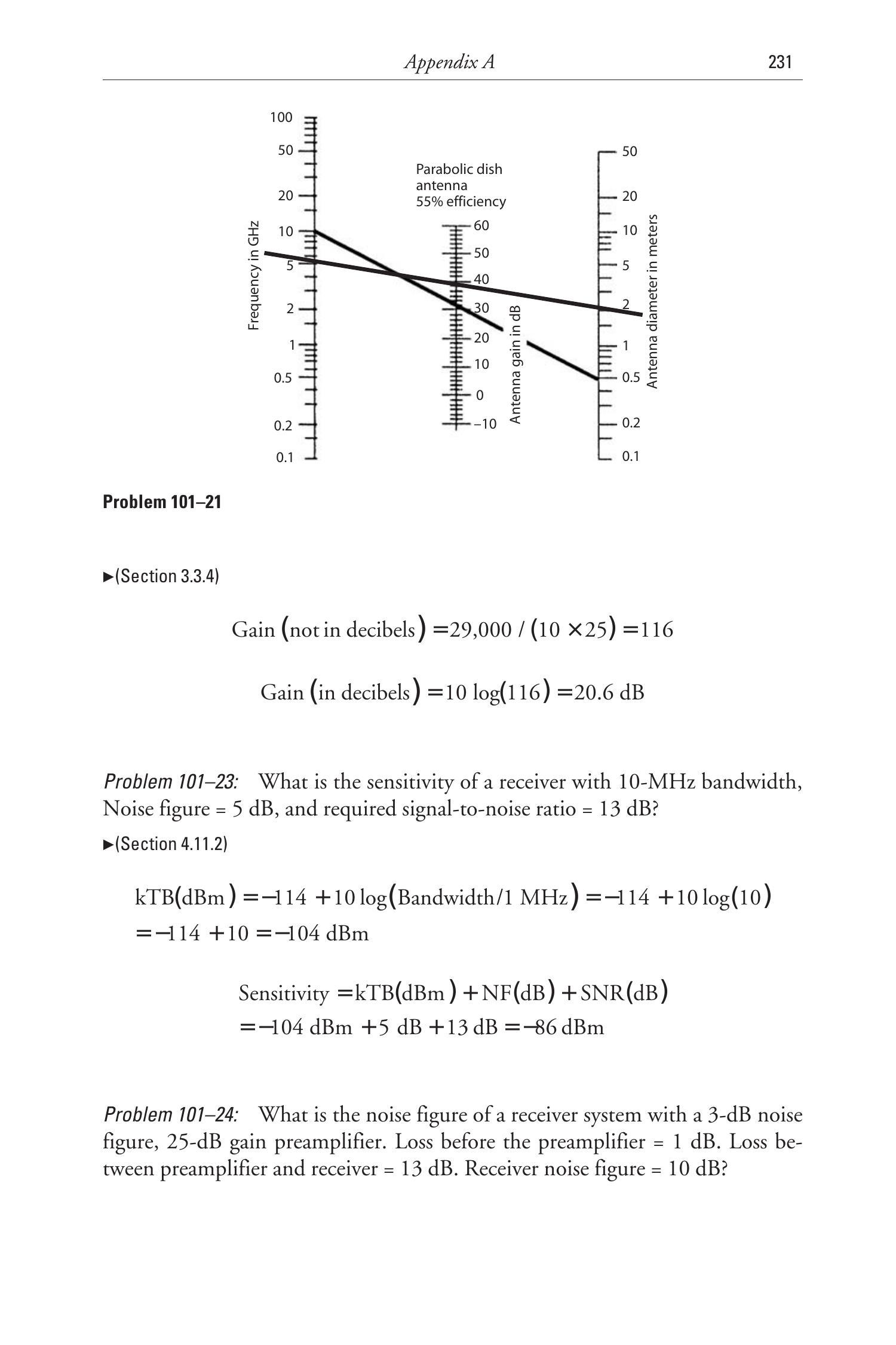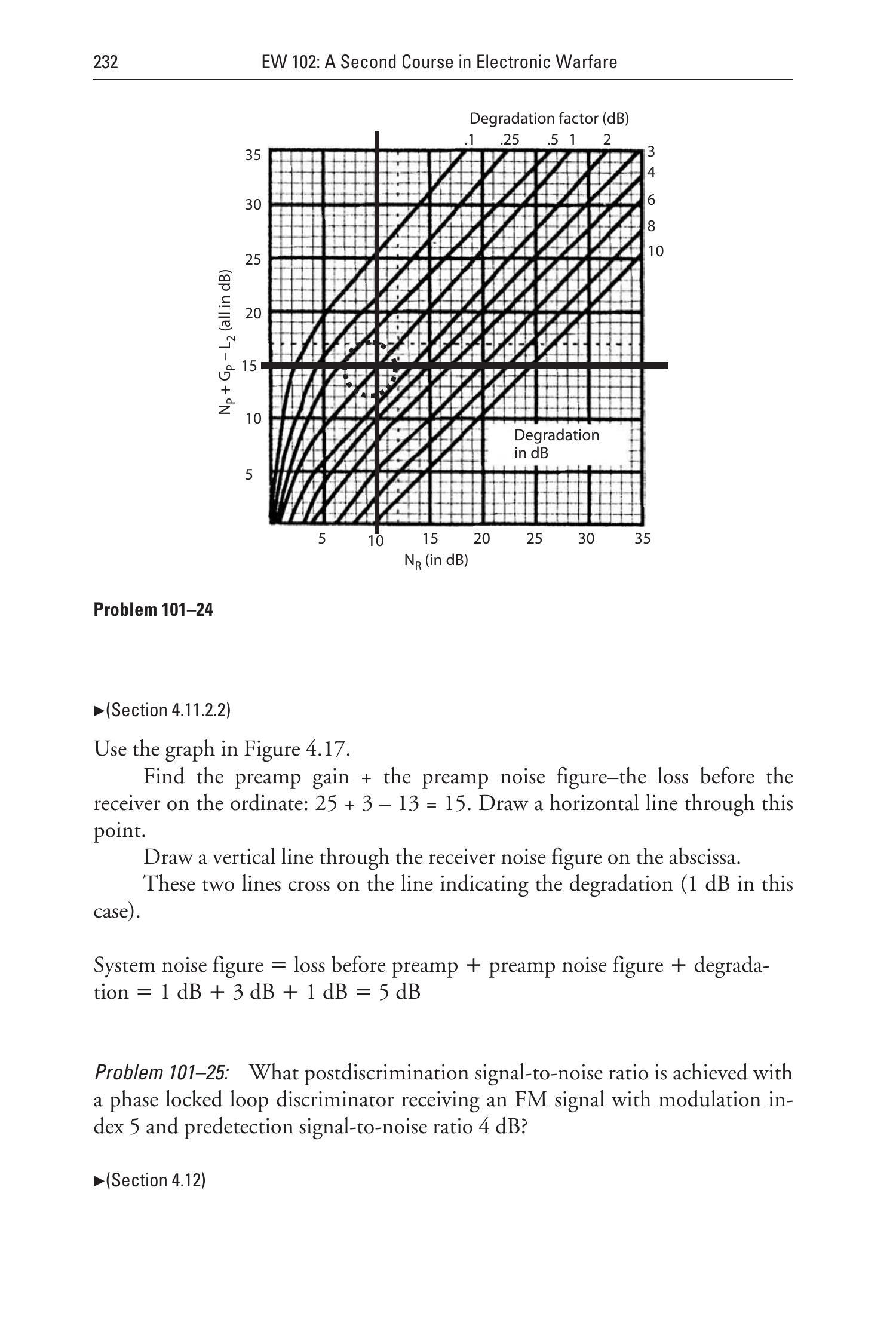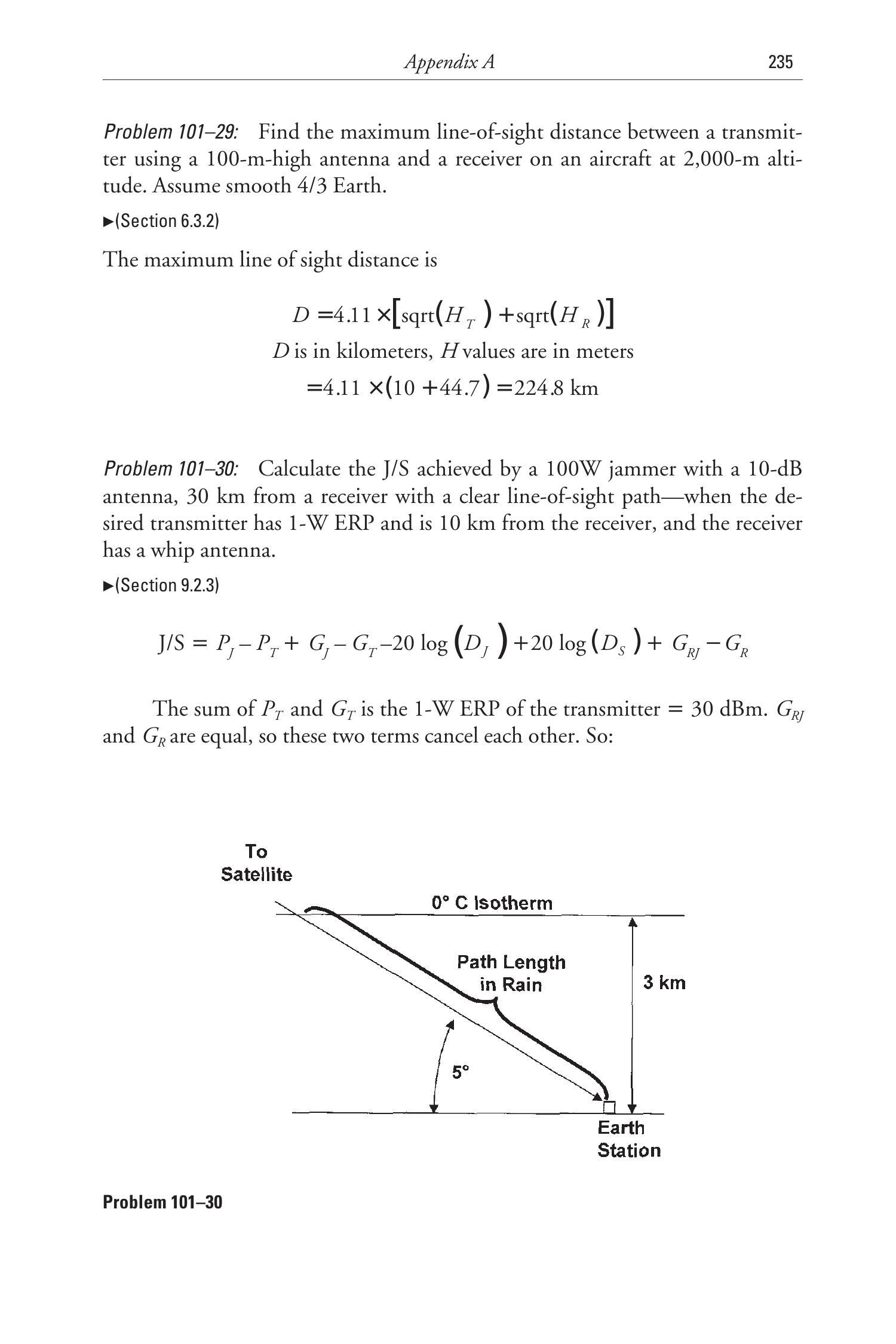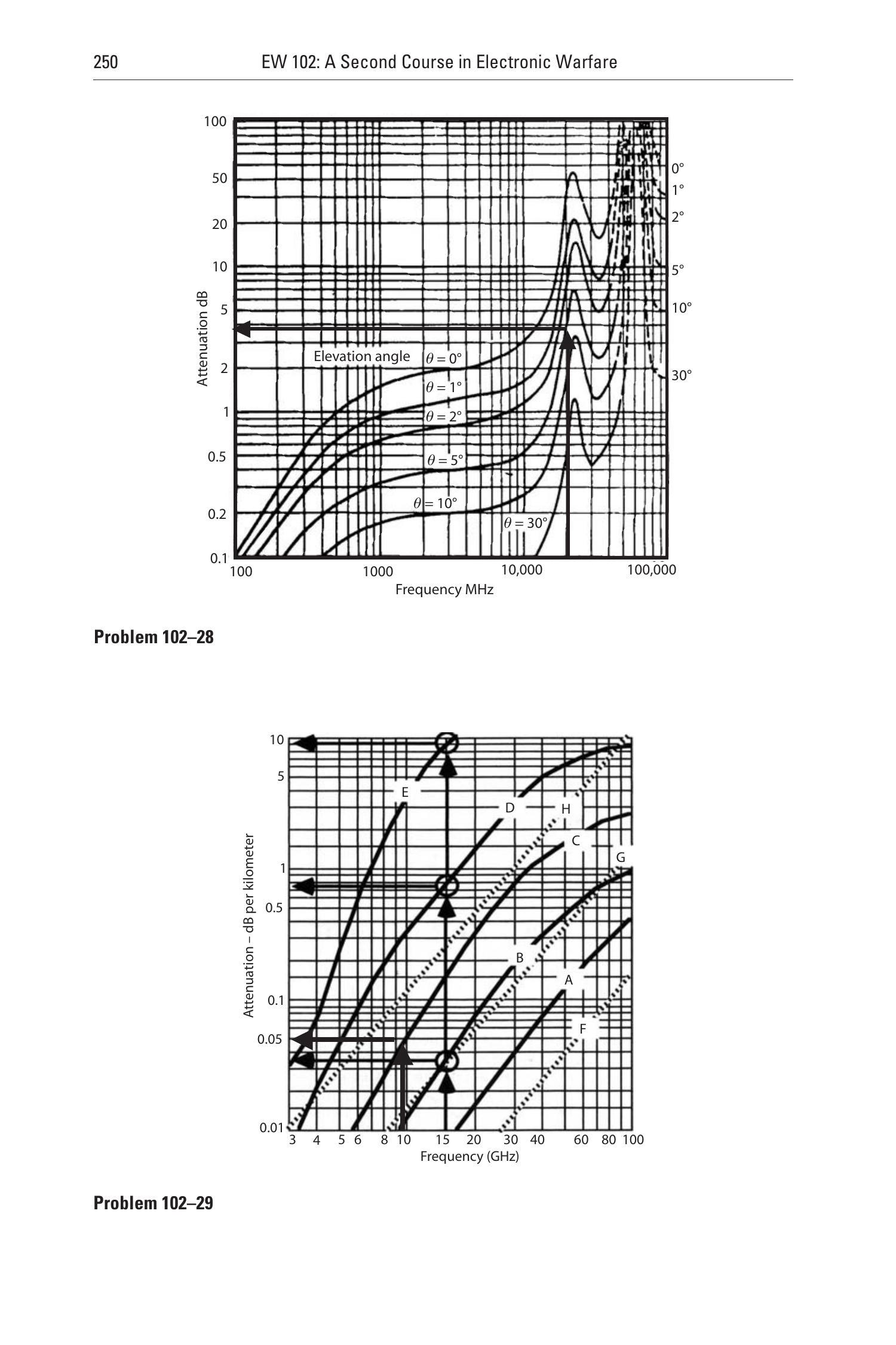 为响应众多请求,本附录收录了来自《EW 101》和《EW 102》两本书中的问题。每个问题的解答均以 \(1-\mathrm{dB}\) 的分辨率计算,并使用相应的公式形式。当需要使用教材中的诺模图或图表时,将其复制并展示如何利用其求解问题。