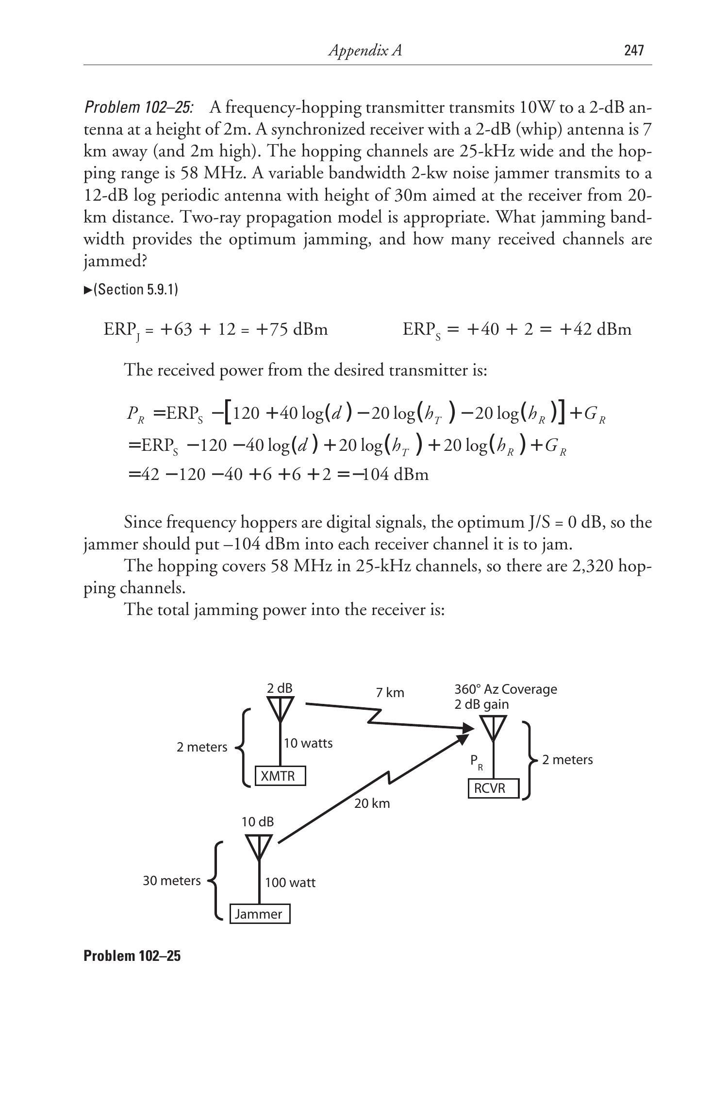 问题 102-25:一个频率跳变发射机向 2 m 高、2-dB 天线发射 10 W 功率。一个同步接收机配备 2-dB(鞭状)天线,距离 7 km(天线高 2 m)。跳频信道宽 25 kHz,跳频范围 58 MHz。一个可变带宽 2-kw 噪声干扰机向接收机发射,配备 12-dB 对数周期天线,高度 30 m,距离 20 km。适合使用双射线传播模型。求最优干扰带宽及被干扰的接收信道数。