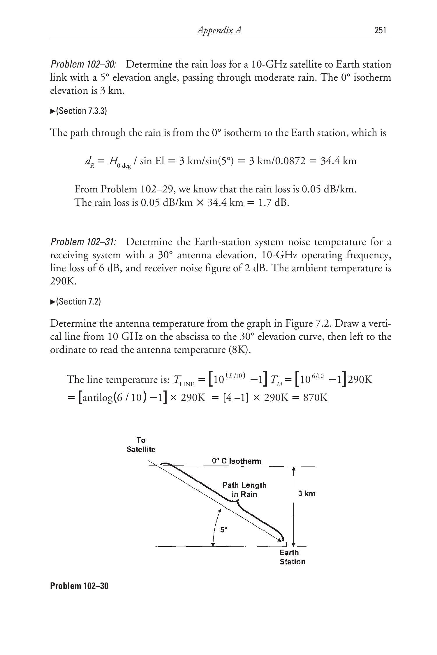 问题 102-30:求 10 GHz 卫星到地面站链路的雨衰,卫星仰角为 \(5^{\circ}\),经过中等雨区。\(0^{\circ}\) 等温线高度为 3 km。