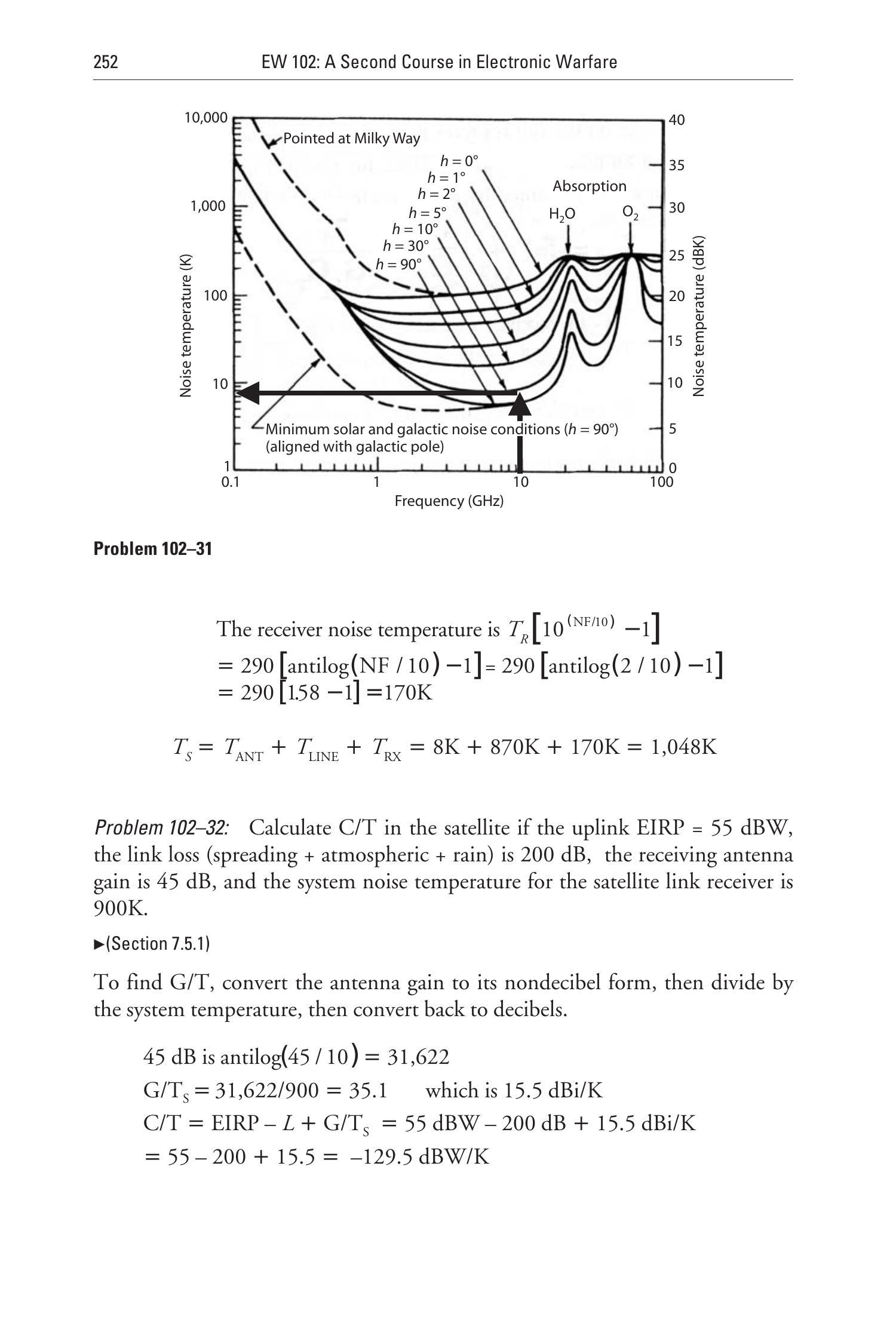 问题 102-31:计算地面站系统噪声温度,接收天线仰角 \(30^{\circ}\),工作频率 10 GHz,线路损耗 6 dB,接收机噪声系数 2 dB,环境温度 290 K。