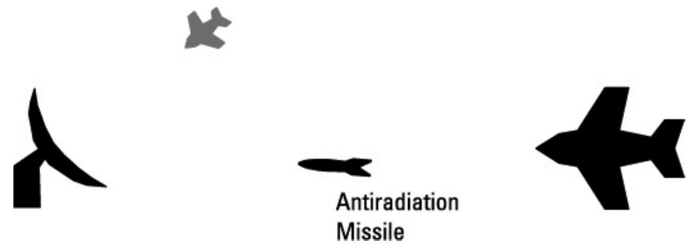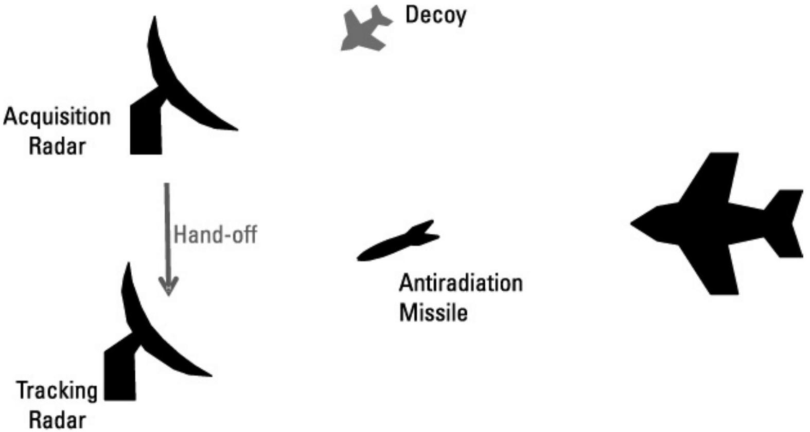 图 10.3 探测诱饵使获取雷达自我获取目标,通常需要启用跟踪雷达,从而使跟踪雷达成为反辐射导弹的目标。