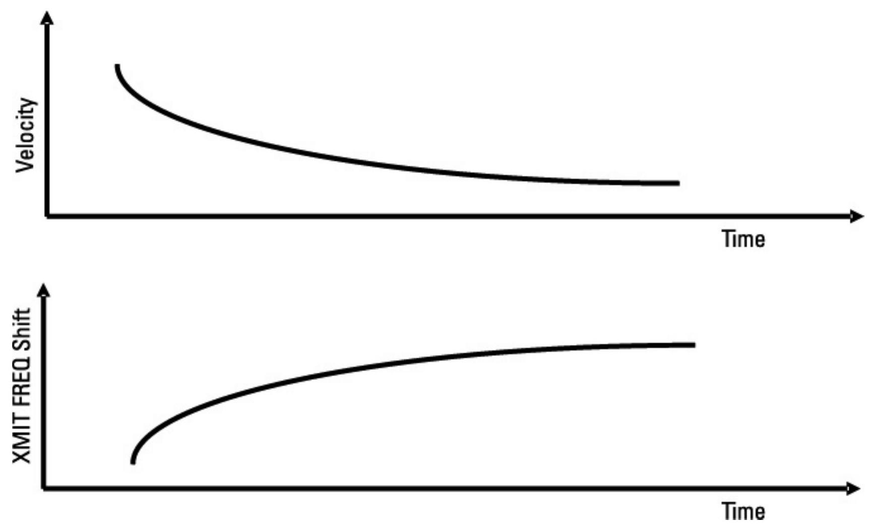 由于飞机速度较大,它们会产生显著的多普勒频移。如果诱饵从飞机上释放,它们会由于大气阻力而迅速减速。这会使多普勒频移发生显著变化,因此重新发射的雷达信号必须进行补偿。敌方雷达可能会拒绝返回时间变化信号频率、具有大气阻力减速曲线特征的诱饵。这意味着诱饵可能需要返回带有适当频移的雷达信号,以模拟真实目标的正确多普勒频移。图 10.9 展示了从移动飞机释放的物体(例如诱饵)的速度随时间变化,以及为了让雷达认为释放物体具有与释放它的飞机相同速度所需的频率变化。