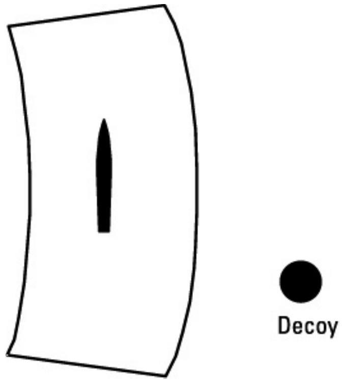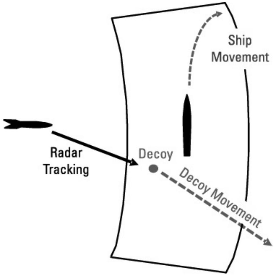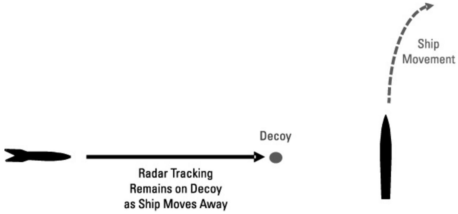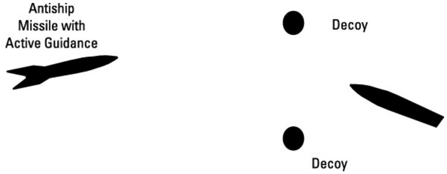 注意,干扰诱饵或箔云的布置不得将导弹指向另一艘友军舰船,如图 10.15 所示。导弹具有延迟接触引信,因此不会被诱饵或箔云引爆。如果导弹离开箔云(或越过诱饵),它将重新进入获取模式,如果随后获取另一艘舰船作为目标,新目标舰船将没有时间采取有效对策。