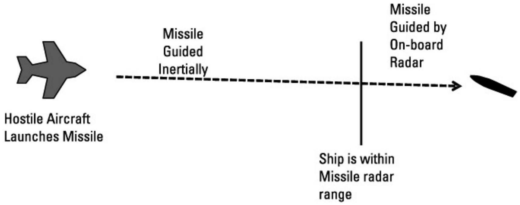 图 10.13 从远程发射的反舰导弹通过惯性制导抵达舰船大致位置——进入雷达探测范围后,其机载雷达引导导弹至目标。