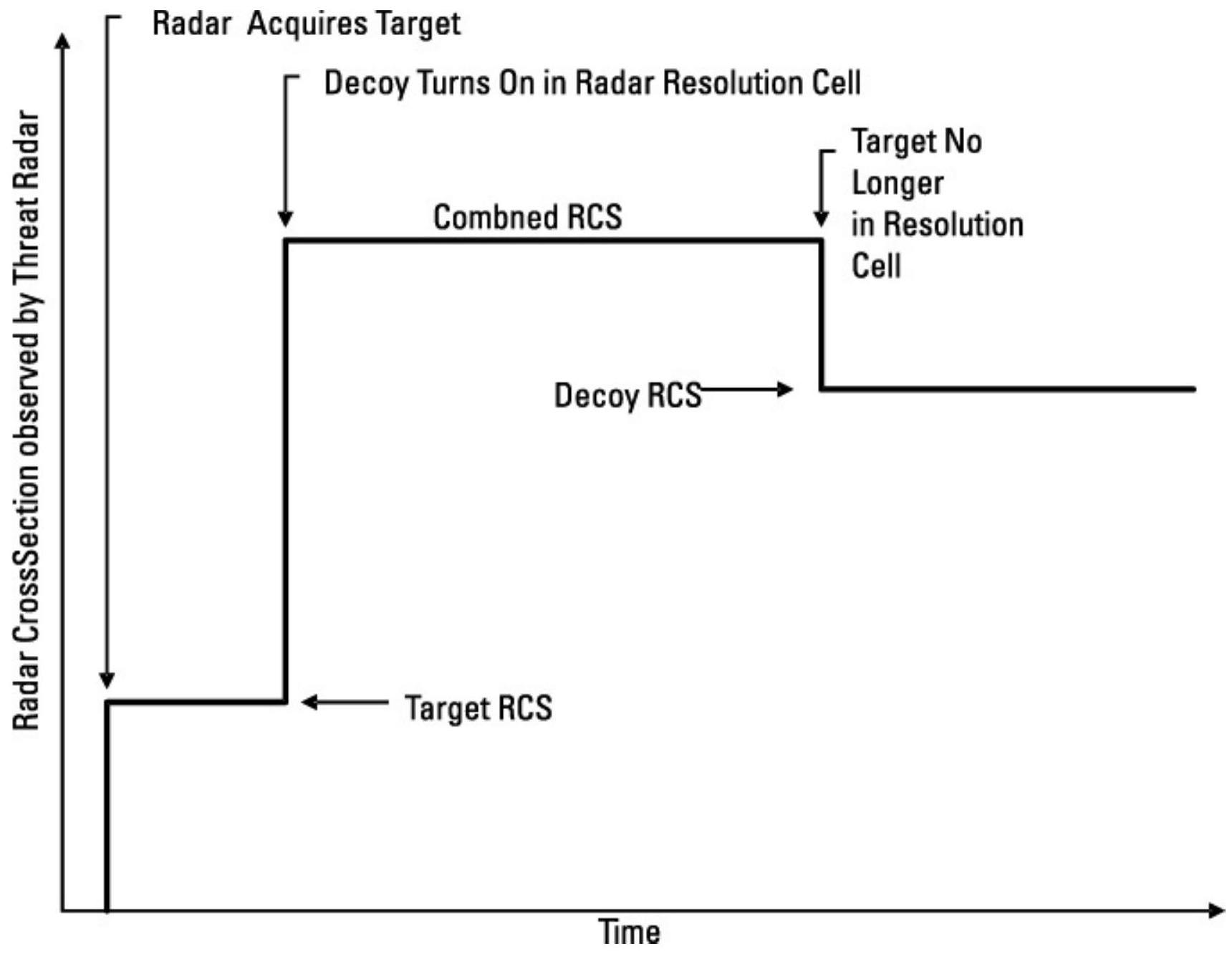 如果雷达最初在跟踪目标,它将看到目标 RCS,如图 10.19 所示。随后,当诱饵启动时,雷达将看到诱饵与目标的合成 RCS。诱饵将远离目标移动,目标最终将离开分辨单元。然后,雷达将仅看到诱饵的 RCS。