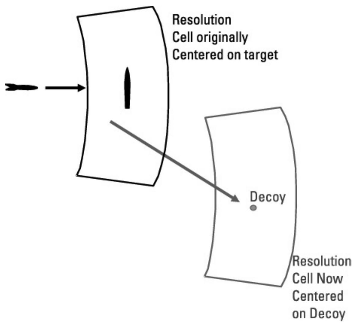 图 10.20 诱饵的更大 RCS 使威胁雷达的分辨单元跟随其远离目标移动。