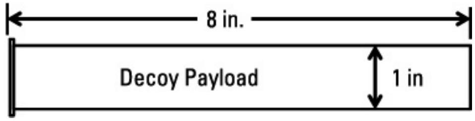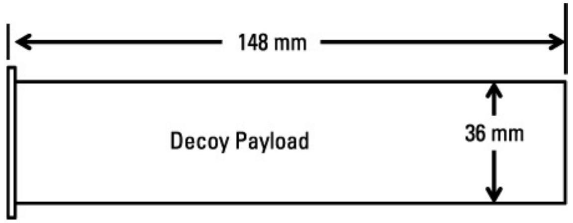 一次性飞机诱饵由与发射干扰箔或红外诱饵相同的发射器发射。对于美国空军和陆军飞机,红外诱饵为 \(1 \times 1\) 英寸方形,长度为 8 英寸,如图 10.25 所示。对于美国海军飞机,它们为圆柱形,直径 36 mm,长度 148 mm,如图 10.26 所示。无论哪种情况,诱饵通过电力发射进入气流,启动后立即开启。