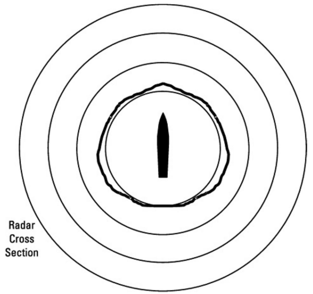 一般情况下,从舰船的侧面攻击时,其 RCS 通常比从船首或船尾攻击时更大。图 10.29 是一艘老式舰船的典型 RCS 与方位角关系示意图,而图 10.30 显示了一艘现代舰船,其外部几何形状经过设计以减少雷达反射。