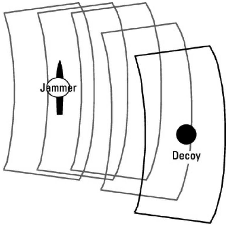 图 10.2 饱和诱饵“诱导”雷达跟踪,使其偏离原本目标并引导至其他位置。