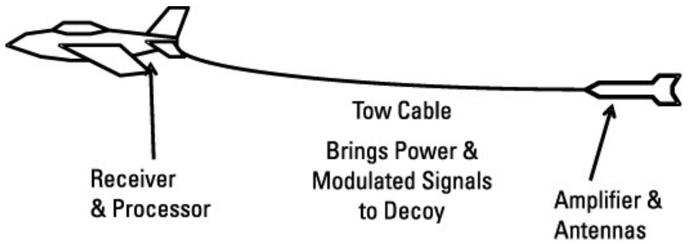 图 10.35 拖曳诱饵通过拖曳索连接到拖曳飞机,同时信号从飞机上的接收机/处理器传输到诱饵内的放大器和天线。
